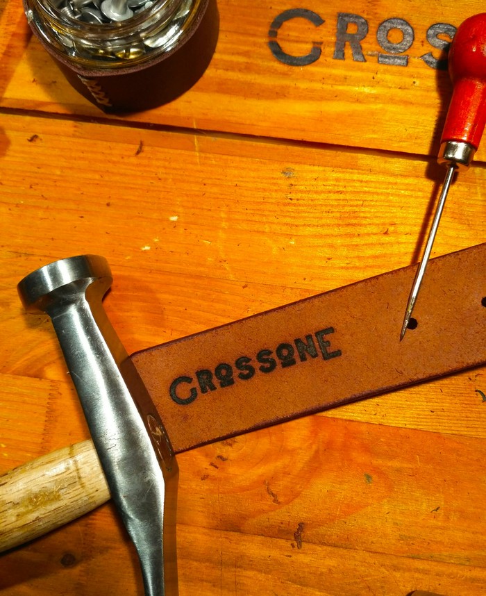 Размечаем и пробиваем отверстия.Ставим клеймо-логотип. Раскаляем на огне и прижигаем