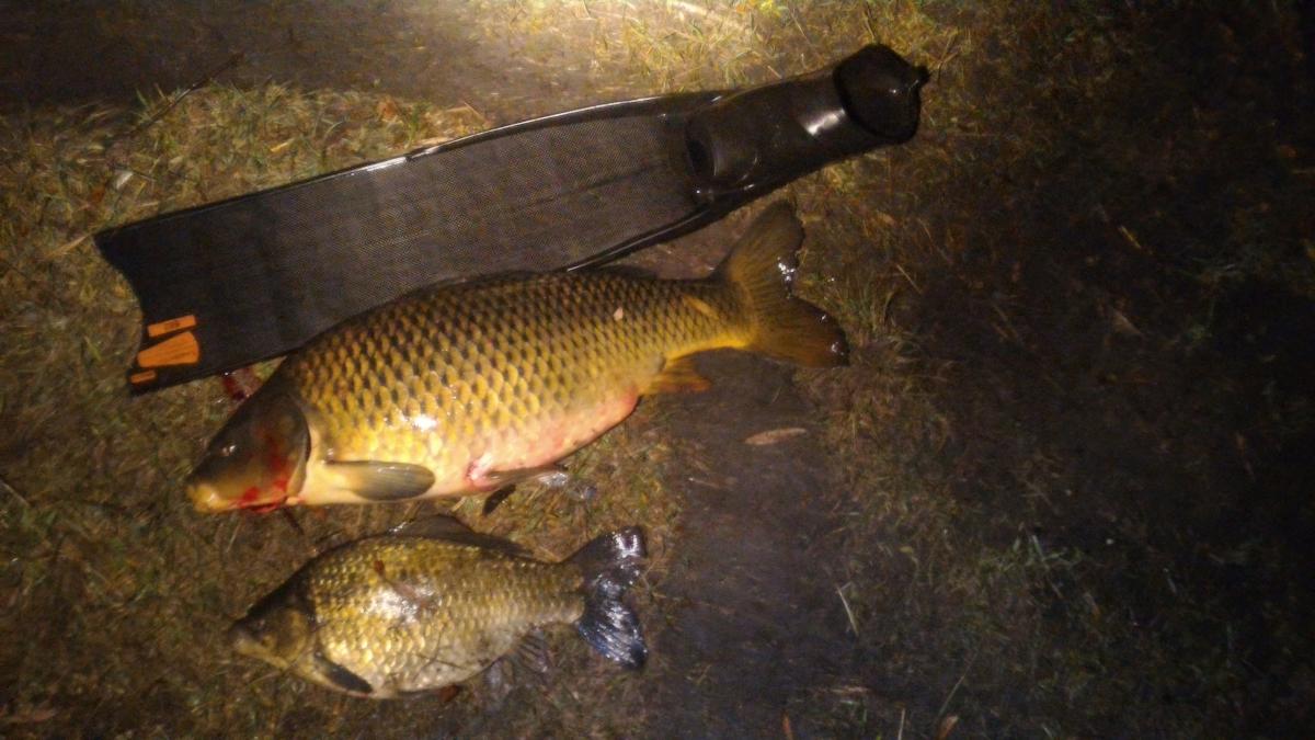 Иду дальше, смотрю в завале веток деревьев хвостик неплохой шевелится... до него далеко, ветки ближе не пускают и глубина см. 30. Ладно. Отворачиваю тихонько в глубь, потом разворачиваюсь, ныряю с огибанием рельефа дна дохожу до него и стреляю, но глубины нет, скорости уже тоже и меня тащит на верх... вообщем выглядело это все как слон в посудной лавке, но рыбку добыл. Это был сазанчик на 1,740 кг. Выполз я из завала, сазана насадил на кукан, иду дальше... И тут из темноты выходит на меня посмотреть зубастая красавица... весу в ней за 5 кг. Но я же эстет, сверху стрелять не буду, а посему нырк, а она от меня под меня ушла, я в кувырке за ней, она в траву с илом зарывается, но не получается у нее, выскакивает, я за ней, а она в завалы и все я ее потерял... иду дальше, смотрю по сторонам, а себя ругаю за нерасторопность, и тут за поворотом не спеша дефилирует красавец. Весь такой золотой в свете фонаря... У меня мысль в голове мелькнула: "сейчас промажу". Но, говорю я сам себе - нет. Выстрел и он на лине. Тащит меня, я за ним, он от меня в завалы, я за ним... Вообщем победа за мной. Это был сазан на 6,460 кг...