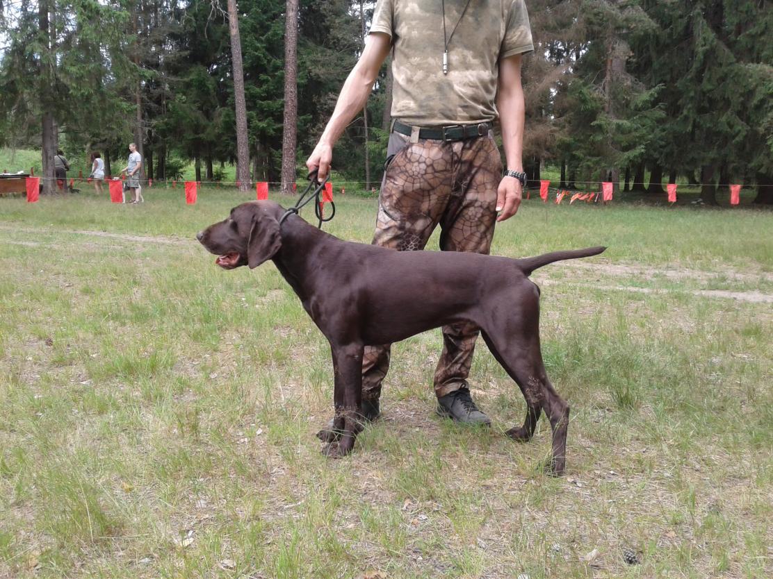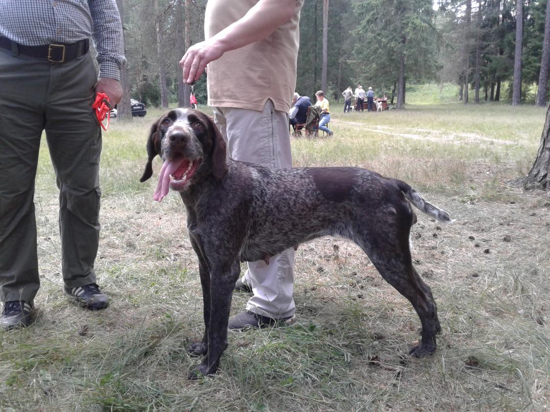Дратхаар Жак-Жар Рагнар, вл.Старовойтов А.С., младшая возрастная группа, 1-ое очень хорошо, II плем. класс, 85 баллов, БСМ, БСЖ.