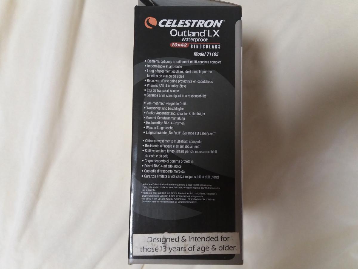 Продам бинокль  CELESTRON OUTLAND LX 10X42. Не путайте с более дешевой серией X. Серия LX на момент покупки из верхней линейки, сейчас соответствует серии DX. Отличная цветопередача и очень высокая резкость изображения.  Остальные данные можно прочитать на фотографиях коробки. Механика и оптика в идеальном состоянии. Местами не много потерто резиновое покрытие на барабанчике наводки резкости. Цена пусть будет 4700. Азотозаполнен и водонепроницаем, само-собой.