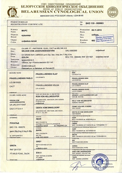 6. Все дипломы за рабочие качества с указанием по виду дичи: 1- ДII б/д, 2-ДIII б/д, 1-ДII п/д, 2-ДIII п/д Чемпион Беларуси по рабочим качествам (дупель),Чемпион Беларуси по рабочим качествам (куропатка). Серебряный призер открытого чемпионата курцхааров Сож-2016. Полевой победитель открытого чемпионата РБ Горка-2017.