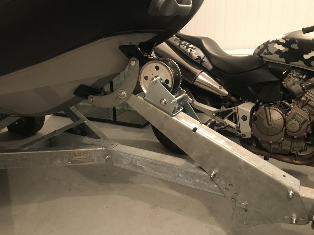 Пока что он опущен максимально низко и сдвинут максимально вперед, дабы транец был вровень с габаритами, верхний упор нужно будет повернуть, чтобы туда сел киль, сейчас лебёдке работать не мешает..