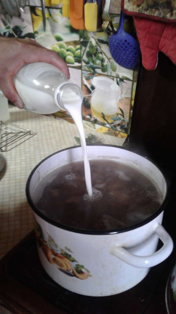Как только овощи и грибы сварятся, выливаем в кастрюлю литр настоящего жирного молока, у меня козье. Прибавляем огонь и доводим до кипения. Берем манку 2-3 ст. ложки и помешивая суп (чтобы не было комочков) засыпаем в кастрюлю.