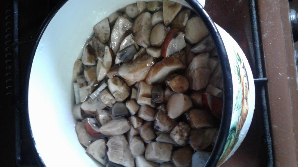 Чищеные, резаные и мытые грибы кладем в кастрюлю 1/3 (в моем случае 4,5 л.), заливаем водой до половины кастрюли и ставим на огонь.