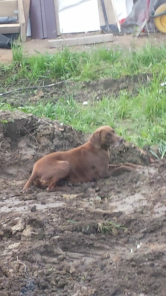 Прибился в конце июля . Породу определить не могу .Похож на гончака но окрас коричневый .кобель . хвост купирован .без ошейника .