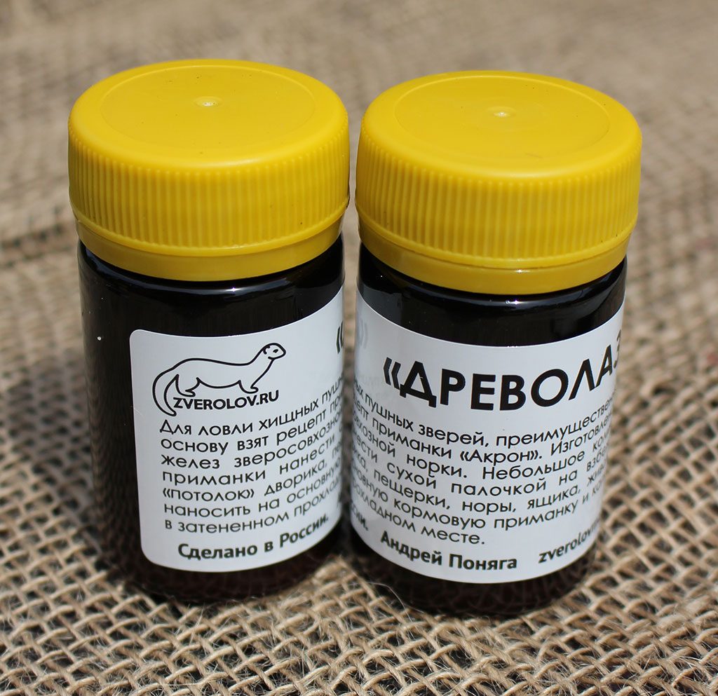 Для ловли хищных пушных зверей, преимущественно куньих. За основу взят рецепт приманки «Акрон». Изготовлена на основе желез зверосовхозной норки. Небольшое количество этой приманки нанести сухой палочкой на взбежек, жердь, «потолок» дворика, пещерки, норы, ящика, живоловушки. Не наносить на основную кормовую приманку и капкан. Хранить в затенённом прохладном месте. 55 мл