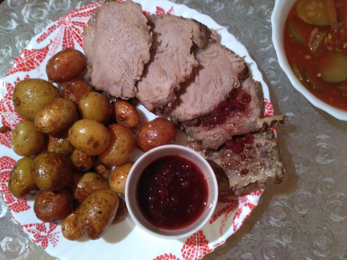 Тож попробую с брусникой , от красной смородины только желе осталось . Про курицу- это для тех , кто на "диете"? До этого , по рецепту Алексея делал рулет из двух копытных -супер , даже те кто не ел дичину до этого , были в восторге . Думаю , что дичина с этим соусом заставит многих соскочить с "диеты".Вот и тот рулет (я только сыр добавил).Фото0014.jpg