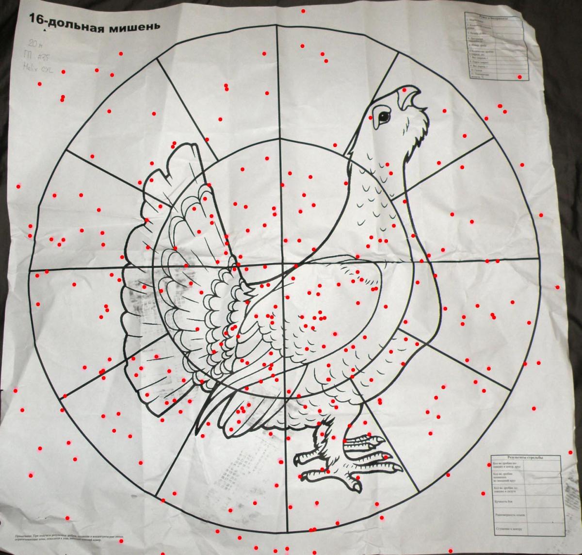 Мы не можем гарантировать, что распределение дробин в осыпи будет равномерным в одном выстреле. Мы также не можем гарантировать постоянство распределения дроби от выстрела к выстрелу. Поэтому как раз и необходимо определить разброс центров осыпи по серии, четко установить размер этой группы и уже дальше принимать решение в зависимости от полученного результата.