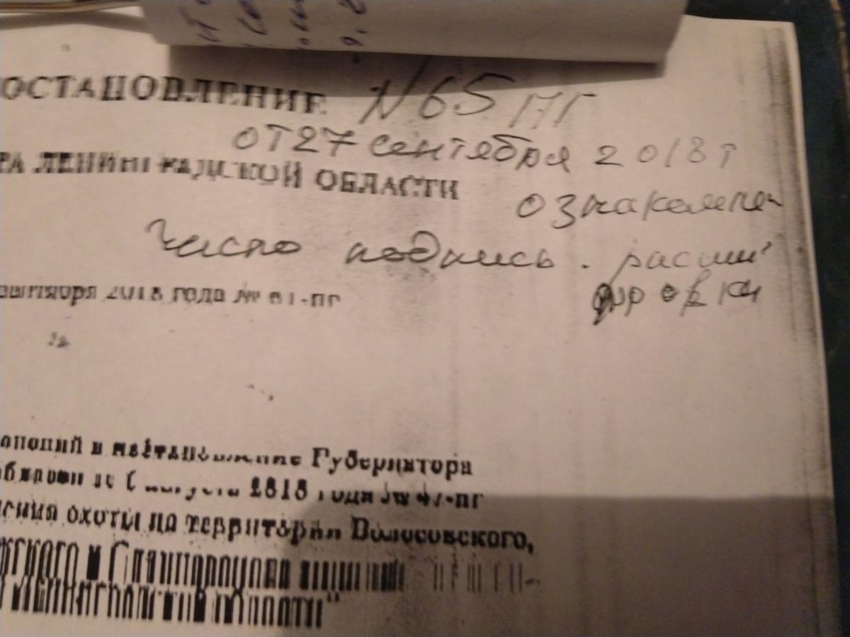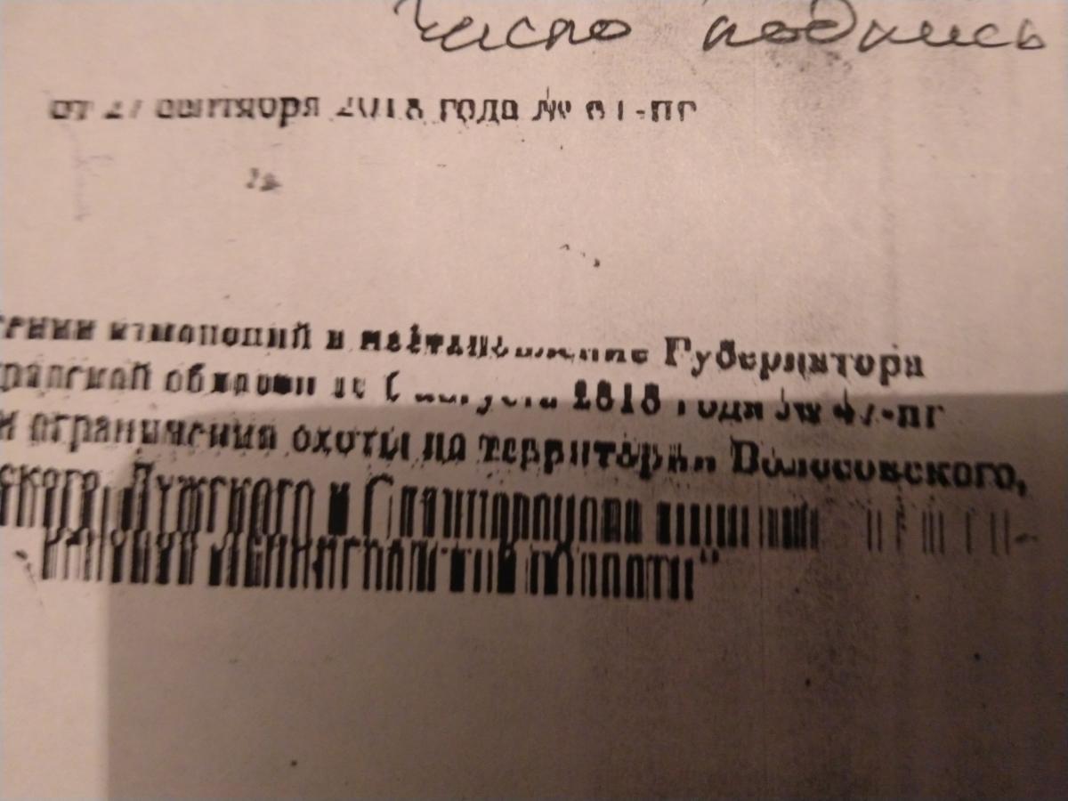 Приехал сегодня в Лужский район, хотел купить путевку гостевую лооир . Путевки (гостевые и для своих) есть но их продают с ограничениями, указавается псевдо приказ , и берут письменное согласие на его соблюдение, в разрешение ни чего не пишут об этом ограничение. И не дают путёвку без письменного согласия на приказ. Охотиться не получилось, егерь ссылается на приказ который ему выдало руководство, при общении с руководством лооир, а точнее председателем Лужского района мы не нашли общего согласия. Хотелось бы ознакомить с псевдо приказом от 2818г господина Макарова Председатель министерства финансов.