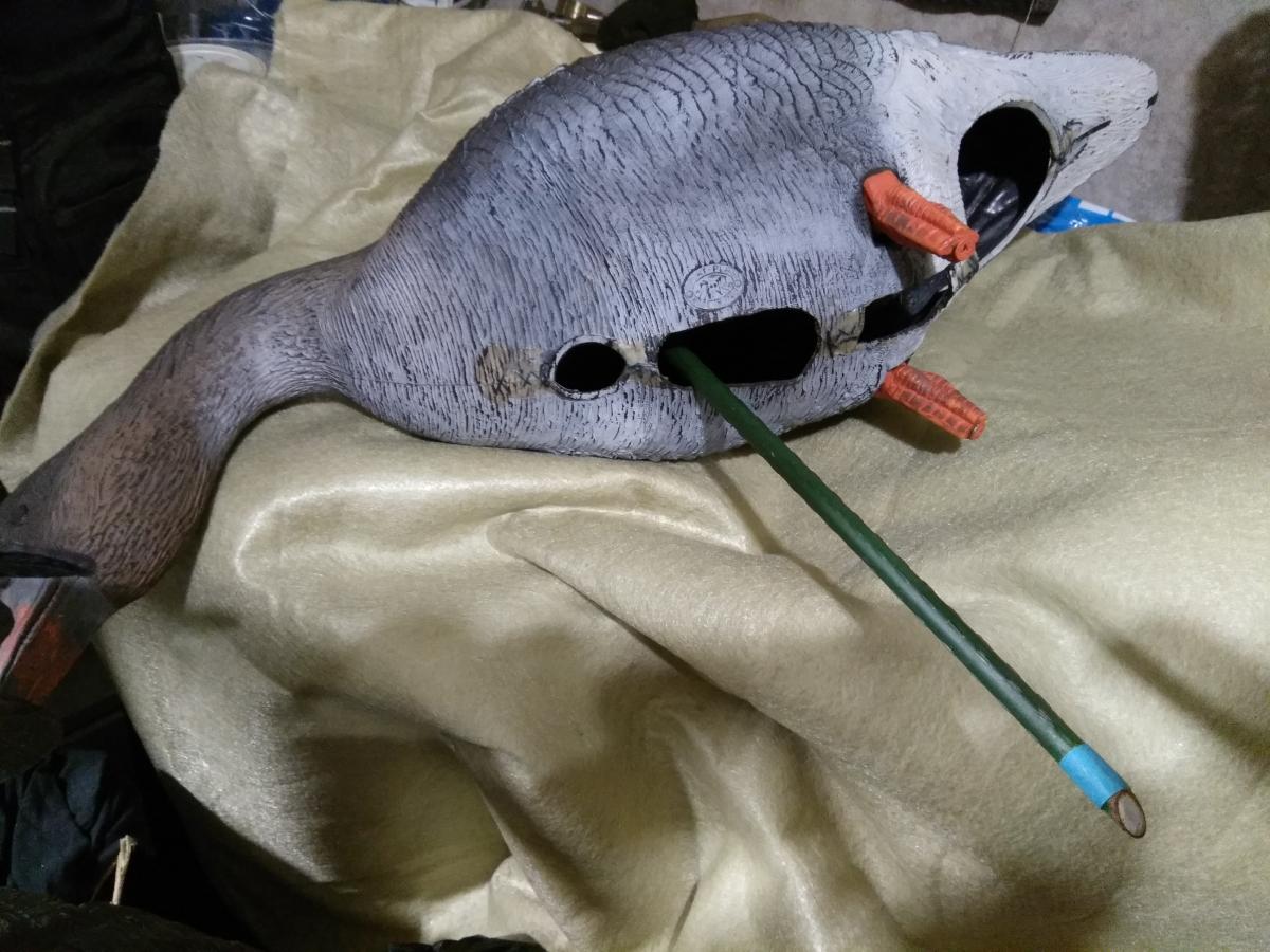 брал 2 года назад в чучалке; сразу были сделаны другие стойки (более лёгкие), т.к. родные каждая по кг.; родных сейчас нет, где-то затерялись; так же переделаны лапки: снимаются и ставятся одним движением руки (сделаны съёмными для более удобной транспортировки; рядом со штатными отверстиями в "пузе" под стойку, - вырезано ещё по отверстию для разнообразия наклонов каждого из чучал (и попытка достичь постоянной "игры" на ветру.