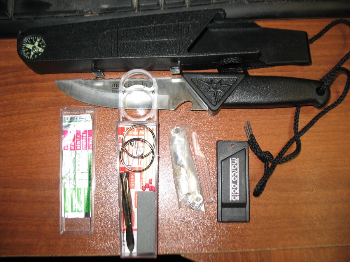 Комплект: Нож, пластиковый чехол с компасом, линейкой, азбукой Морзе, свисток, бокс с принадлежностями (лупа, скальпиль, рыболовный комплект, струнная пила, спички, булавки, оселок, пинцет, пластырь, таблица сигналов, и ещё какая-то пластиковая приблуда)