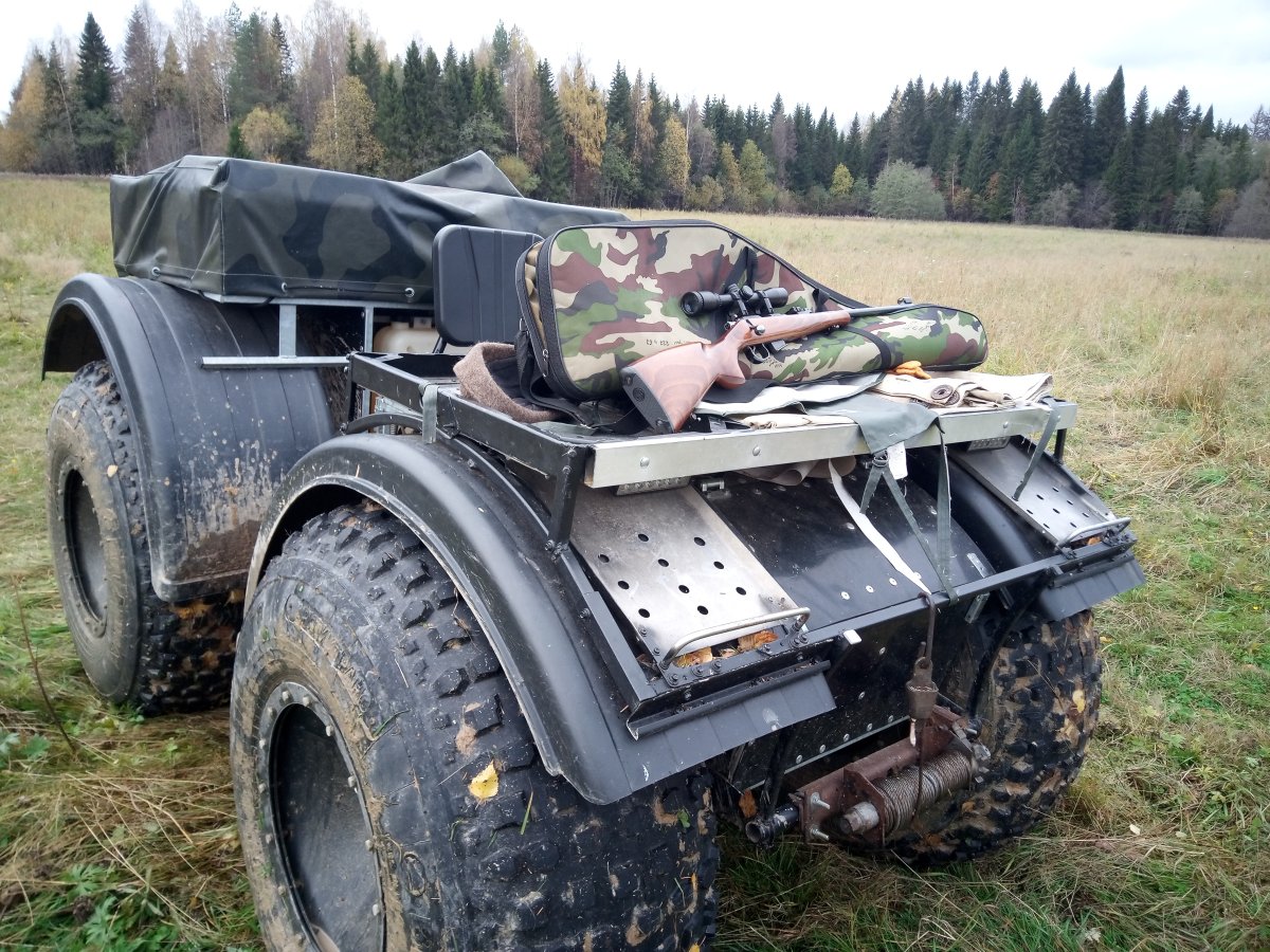 А без груза идет спокойно. Уж что-что, а проходимости за глаза. В прошлом году сдуру решил поехать по одному профильку через верховье ручья, и бухнулся в выкопанную тракторами лужу, вода с торфом и илом. Бухнулся в нее с разбегу, колеса и нижние звенья цепи погрузились в эту чачу, смеркается, а у меня с собой ни лебедки ни даже топора...что делать, думаю. Без особой надежды газанул, внезапно колеса закрутились разбрасывая ил, вездеход тихонько тронулся вперед, цепанул передними сухую землю и легко выбрался из засады самостоятельно. Будь он чуть потяжелее из такого места пришлось бы рвать трактором.