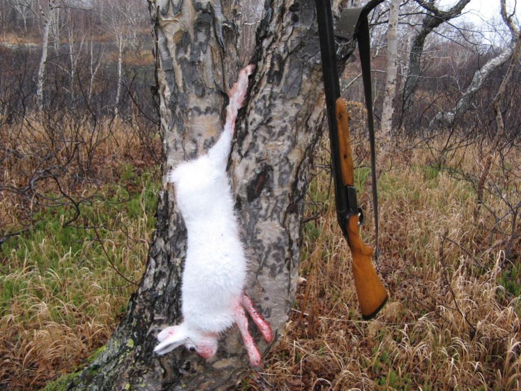 Обычно заяц сам поднимается с лежки и пропрыгав немного останавливается посмотреть- кто там шуршит ветками и травой в его сторону…..И охотнику нужно в таком случае приложить очень много усилий, что бы подкрасться на выстрел. Ветер и дождь- помощники охотника в скрадывании, тогда есть вероятность подойти к зайцу очень близко даже на лежке (если увидел). К этому зайцу напрямую я не пошел- бесполезно. Пошел влево по кустам и буеракам с «правым уклоном»….что бы в итоге подойти к зайцу как бы « с тыла»…Шел по угодьям очень тихо, ветра нет, стоит мертвая тишина, но почва и листва с ветками мокрые- не сильно шуршат. Когда все-таки дошел до центра цирка, зайца уже там не было. Честно говоря надежды, что он будет меня «ждать» не было никакой. Пошел по кустам дальше вправо. Вот очередной гребень/возвышение….Осматриваю окрестности- «бац!» - впереди на вершине увала сквозь траву и кусты видно белое пятно. Сидит. Он. Может тот, который первый, а может и другой. Скорее всего первый. Новый бы лежал и я бы его наврятли увидел в траве. А этот сидит на попе. Медленно и верно спускаюсь с гребня вниз…прохожу немного по сыпухе к склону ближе к зайцу (снизу его не вижу)…отхожу чуть в сторону – нет зайца. Вот сучонок, услышал таки или увидел мои телодвижения. Хотя крался я очень старательно. Что ж, иду дальше. Поднимаюсь на этот увал, прохожу дальше по сопке….Выхожу на очередной плоский цирк с кустами в центре, осматриваюсь по окраинам- никого. Прошел пару метров влево, опять осматриваюсь…и….впереди слева за кустами метрах в 100 вроде цвет травы другой -белее. Смотрю в бинокль- блин, заяц. Лежит в траве. Шкурка белая сквозь траву просвечивает… Просчитал путь подхода, перезарядился в оба ствола 1-цей в контейнерах и начал скрадывать, используя кустики, деревца и складки местности, как прикрытие. Подошел метров на 50, выглядываю из-за кустов- заяц напротив в густых кустах в траве. Ну думаю, надо пробивать. Выстрел. Заяц как-то неуверенно встает, делает шаг замирает- второй выстрел…опять пару шагов…перезаряжаюсь быстро- еще 2 выстрела подряд сквозь кусты и траву…заяц медленно попрыгал по кустам вверх…метров 20 и его уже не видно. Ну, думаю, ему досталось. Надо добирать. Поднимаюсь по его направлению на сопку, осматриваюсь вокруг- никого…делаю шагов 10 вперед и чуть на него не наступаю. Лежит в густой траве мертво. Лишний раз хвалю себя, что всегда тщательно проверяю итоги выстрелов и добираю возможных подранков. Зверь добыт, можно и к дому двигать.
