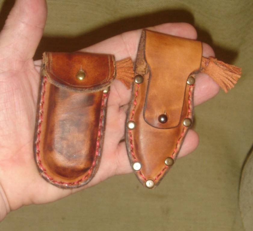 Изготовлю ножны на охотничий нож 900 рублей, чехол на складной нож 600 рублей из натуральной толстой кожи. Ручная прошивка, формовка, тиснение, заклепки, кобурная застежка, шлевка или прорезь под ремень.
