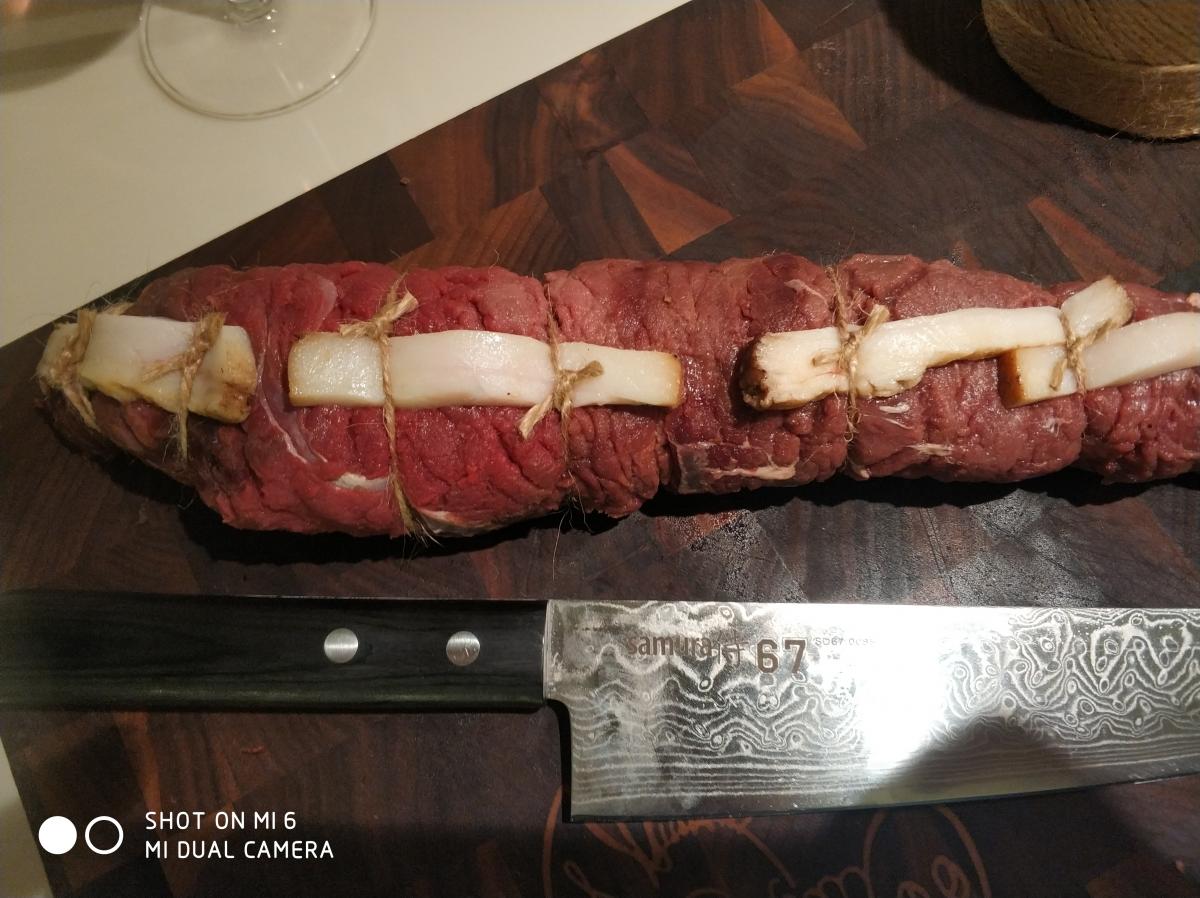 Я хотел оставить акцент на запахе и вкусе дичины, потому не пользовал множество ароматных специй, кои полюбливаю сильно в прочих блюдах, не брал даже чесночок, без которого, как известно, "не надо, а с ним - пусть будет")))))) брусочками копченое сальцо, треть луковки, черный свежемолотый (молотый в пакетиках не использую никогда), и столовая ложка соевого соуса вместо соли. Соль саму по-себев рулет не клал. В общем, выглядело это как-то так: