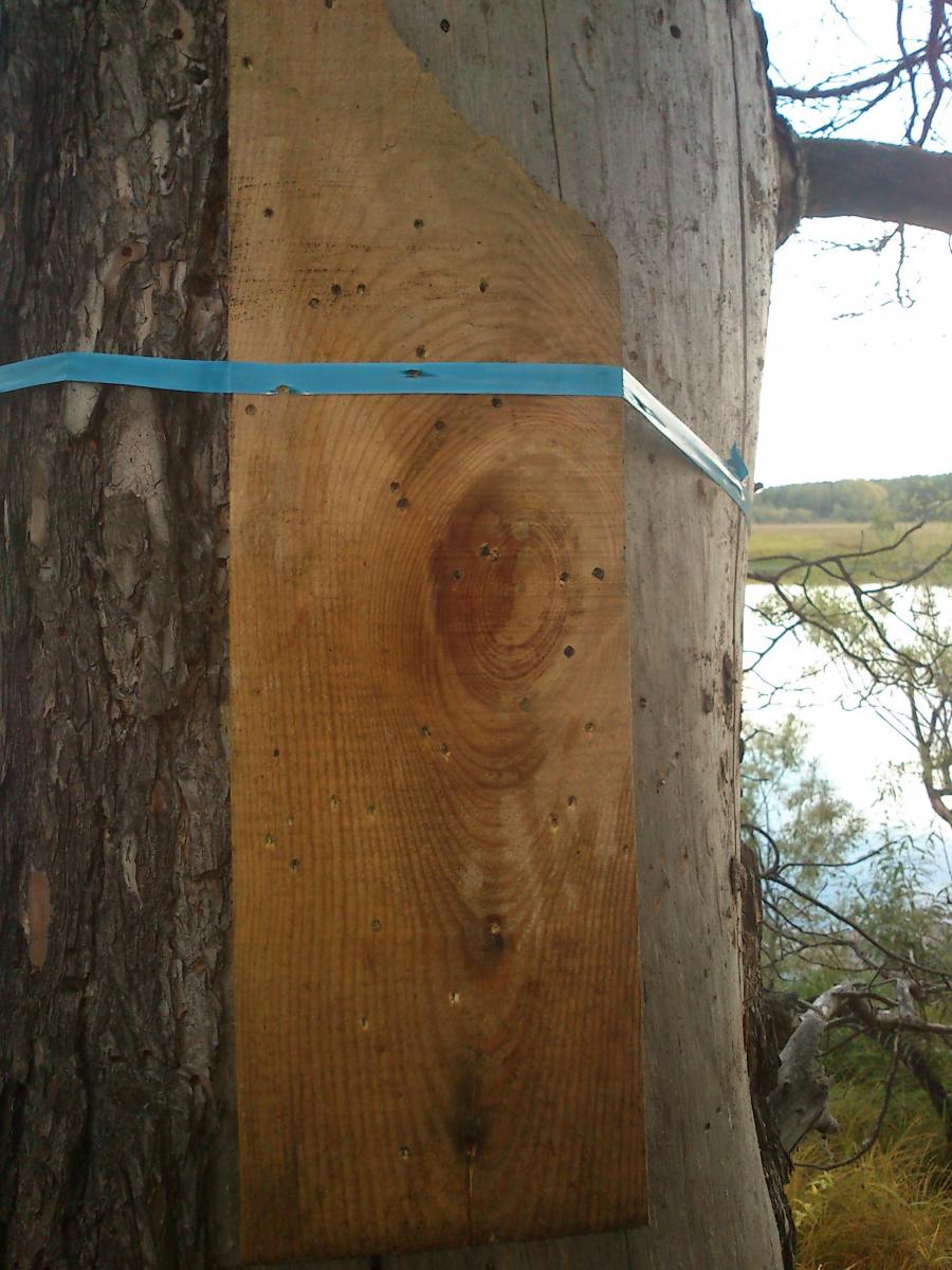 дробь вошла глубоко и кучность вроде не плохая, а в нижней части доски несколько отверстий от выстрела патроном 2,2 гр пороха на 40 гр дроби, дробь раскидало...