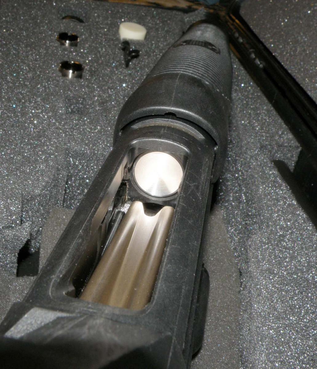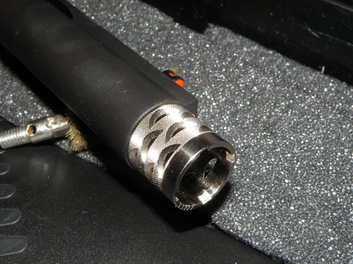 Полагая, что решение об использовании краски для ствола не могло быть принято без проверки стойкости получаемого покрытия к всевозможным механическим повреждениям, я поискал место, где без вреда для нового ружья смог бы субъективно оценить прочность «глубокого чёрного цвета». Обнаружив затекание краски на хромированную поверхность газовой камеры, я взял нож и, практически не прикладывая усилия, пошабрил небольшую поверхность. Удивился результату (на фото) и понял, что я ничего не понял. Вроде бы так нельзя (в смысле никудышной прочности красочного покрытия), но, оказывается, можно…
