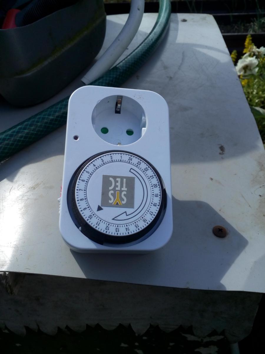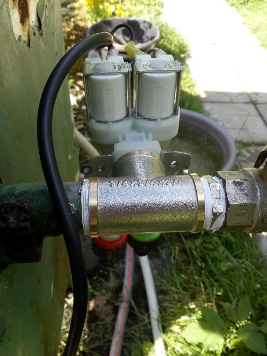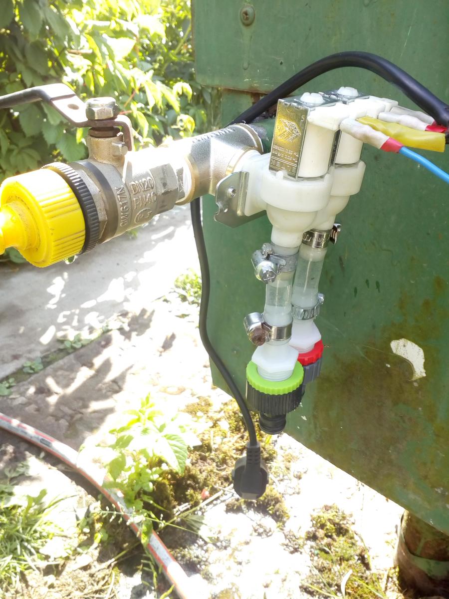 Приколхозил к поливочной насосной станции входной клапан от стиралки на два соска и включаю его через простейший таймер.