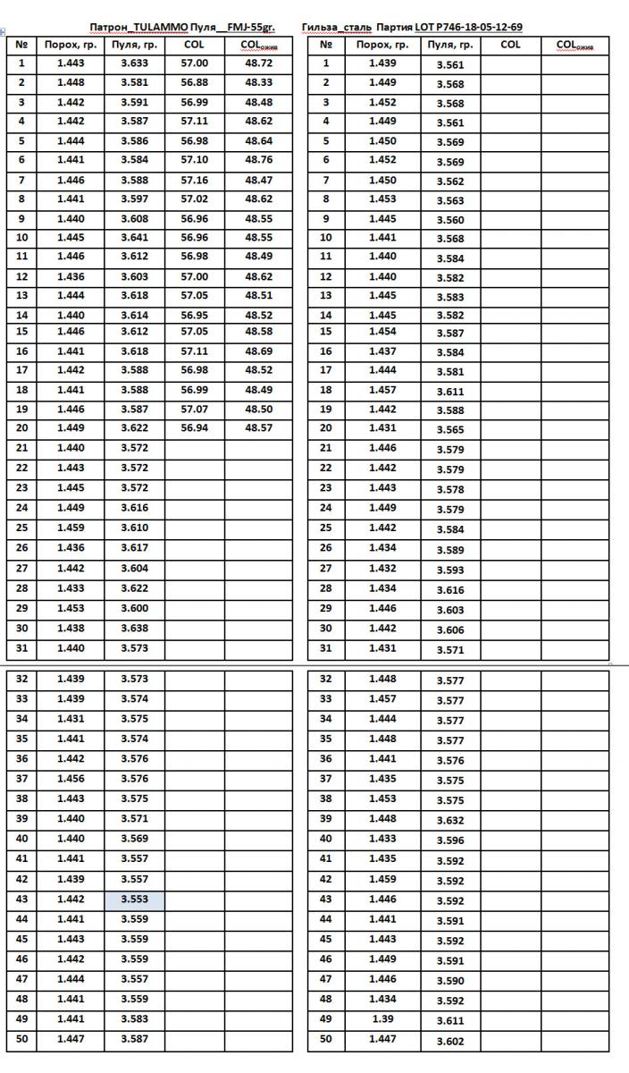 Я поэтому для А-224-2 (у меня пули по замерам получились от 2.972 до 3.006гр) сразу решил начать пробу от 1.50 и до 1.70гр.