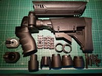 Продаю в Санкт-Петербурге складной регулируемым по длине пластиковый приклад в комплекте с тактическим цевьем ATI TSG-0100 Tactical Stock & Forend with Adjustable Cheekrest, Removable buttpad & Pistol Grip предназначен для установки на гладкоствольные помповые ружья 12 калибра MOSSBERG (МОССБЕРГ) модели 500, 535, 590, 835; REMINGTON (РЕМИНГТОН) 870 и Winchester (Винчестер) 1200, 1300.