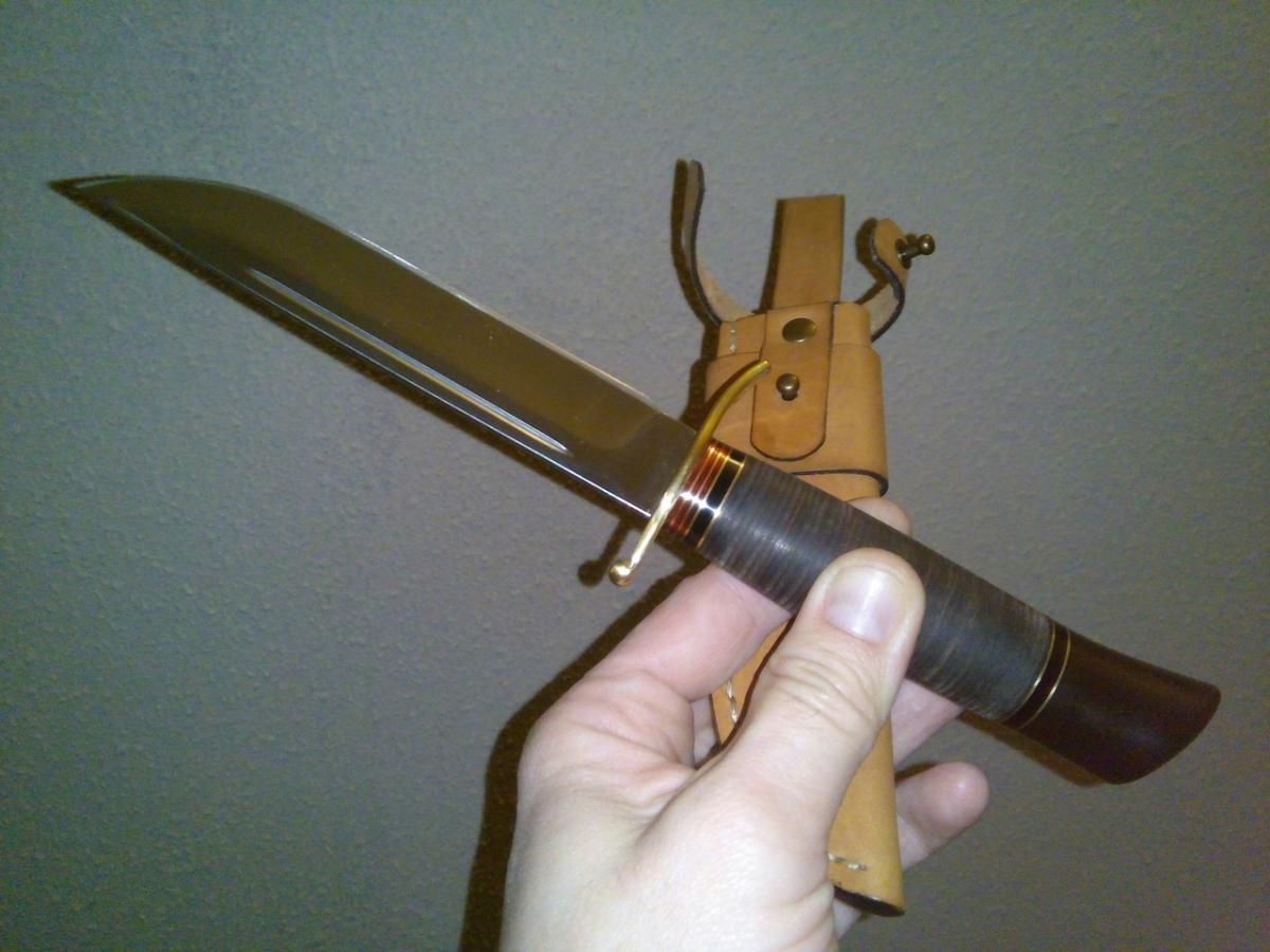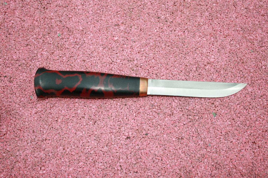 1. Клинок Мора карбон , придропленный . Общая длина 205 мм , клинок 93х18х2 мм .Стабилизированный рог лося , фибра черная , стабилизированный шпальт березы Сто-Термом . Самодельный мозаик-пин . Ножны чепрак , гибкий подвес , окрашены неводной морилкой эбен , финиш обувной воск на горячую .