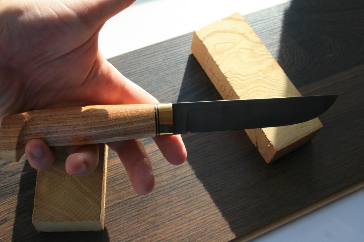 Якут . Общая длина 265 мм .Клинок Сталь с тмо 9хс , кузнец Орлов Святослав ( Северный Всадник в контакте ) , 125х27х4,4 мм . Больстер латунь , фибра , черный орех . Финиш рукояти датское масло , в сечении овал .