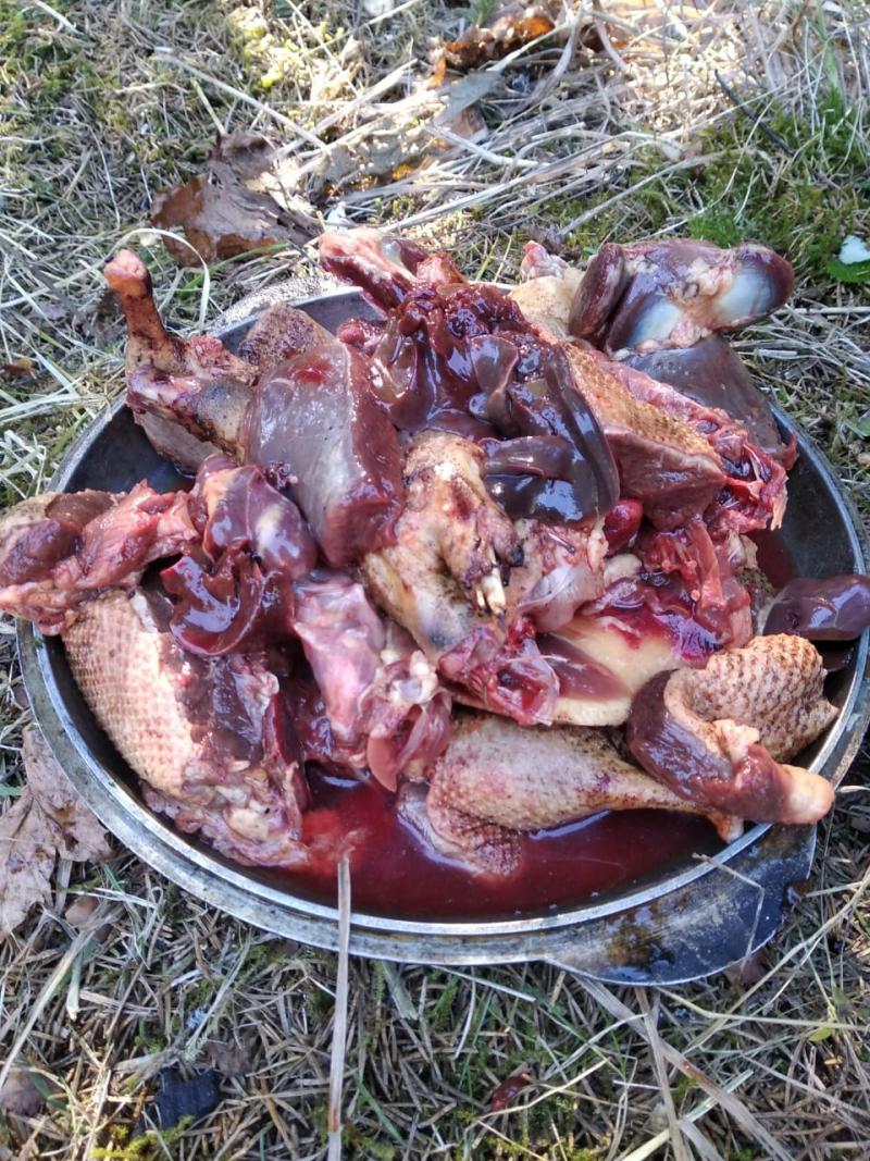 За все время нахождения в угодьях мы видели лишь 2 стаи в стороне. И утро предвещало быть скучным. Проснулись в 3,40. На улице иней. А это означало, что нам необходимо было мыть 120 чучел от инея. Молодое поколение смартфонов и ночных клубов совсем тяжело вставало. Как правило они в это время токо ложаться спасть. Кофе и омлет на скорую руку. Нагрели полторашки теплой воды. Оправились и в путь. В 6,30 пришла на поле 6ка гумяшей. покрутились, но спокойно ушли. Наерное, что им не понравилось. Может сфальшивили, когда манили. в 8,05 пришла большая пачка белолобого, начала крутиться над присадой. Сразу стало понятно, что гусь стреляный. За 20 кругов стая не спустилась ни на метр. Основное стадо ушло и лишь 9шт начали снижаться потихонтьку. Наши нервы на пределе. На круге 50 ил 60, через полчаса дудения в манки. Кое как мы ее спустили на 30м и я даю команду бить. Раздались 22 выстрела, и 1 гусь подранком улетает в кусты. Все посмотрели друг на друга. Но промолчали. Бывает. Подранка нашел Серега, Он так усердно его искал, я аж удивился. Но трофей взять и можно поздравить всех с полем