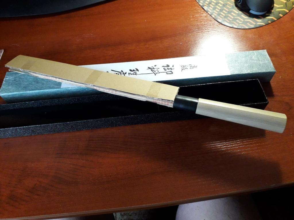 [FONT="]Просматривал где-то 3-4 недели тому назад тему про ножи- «Похвастайтесь своим ножом» . Прочитал пост Неманского про японские кухонные ножи с фотографией. Заинтересовался. Задался вопросом- « …чего это в них такого особенного, почему такой уважаемый человек повыбрасывал все свои старые ножи?»… Начал изучать интернет и отзывы. Еще больше заудивлялся. Оказывается, я со своим точиловом Лански - простой слесарный подмастерье. А имеющиеся в доме цептеровские и другие кухонные ножи- полный отстой и низкопробное железо. Вот с такими мыслями я начал искать приемлемый интернет-магазин для пробной покупки настоящего японского кухонного ножа. Изучить цены на существующее многообразие кухонного ножепрома- та еще задача. Российские магазины сразу отмел. Ебей изучил и другие японские площадки типа Ракутена, Амазона, жапанесшефкнайф и прочие ножевые сайты. Нашел https://www.hocho-knife.com/brands/. А вот отзывов о магазе наших не было. Там прельстило обилие брендов и моделей, русскоязычный перевод. Зарегился и оформил 2 ножа. Чисто внешне и по характеристикам понравились бюджетные варианты от Сакаи Такаюки. Решил брать сантоку и петти в 33-м дамаске с сердечником из ВГ-10. Вот только 120 размера Петти на складе в последний момент не оказалось и мне предложили за те же деньги 150 размер. Согласился. Оформление через [/FONT][FONT="]Paypal[/FONT][FONT="] минутное. Доставку выбрал ЕМС как оптимальную. 8[/FONT][FONT="]-[/FONT][FONT="]го заказал и 19 посыль уже дома. Включая трансфер из Киото-Осака-СПб-МСк- Камчатка. После первого заказа через 2 дня (когда по работе выписали ежеквартальную премию) оформил второй заказ еще на 2 ножа «чисто-конкретно» для рыбы – знаменитую Дебу и янагибу для нарезки филе. Причем 7 разных вариантов ножей для меня оптимальных в соотношении цена/качество присоветовали специалисты магазина и лично г-н Норимаса Кусида. А я выбрал 2 из предложенных. Классику. Белую сталь. Широгами. 10-го оформил заказ и 19 утром он уже прибыл домой, догнав и перегнав первый заказ. Теперь осталось дозаказать в мае оригинальный точильный камень, держалку ножа для заточки и масло для стали широгами ножей. Впечатления от магаза и персонала- только положительные. Японцы адекватные, доброжелательные. Так, что магаз рекомендую. Для оптимизации цены покупки- рекомендую сначала выбрать модель ножа, который вам нужен, бренд. Потом пробить цену этого ножа по всем торговым площадкам, что бы убедится в правильности выбора магазина. Во всяком случае я делал так и оказалось, что везде выбранные мной модели на других площадках стоили дороже. И еще одно наблюдение. На страницах Ебей, когда читал про описание какого-либо недорого японского ножа за «500 рублей», обратил внимание на предупреждение продавца, что:….»товар может быть из японского материала, но изготовлен в другой стране –Китай, Вьетнам, и др. если не стоит надпись «Сделано в Японии». То-есть сами японцы-продавцы предупреждают, что у них могут продаваться ножи «не японские»… Значит есть и у них «подводные камни». Итак. Коробка с ножами. Целая. Сопроводительны доки в кармашке. [/FONT]