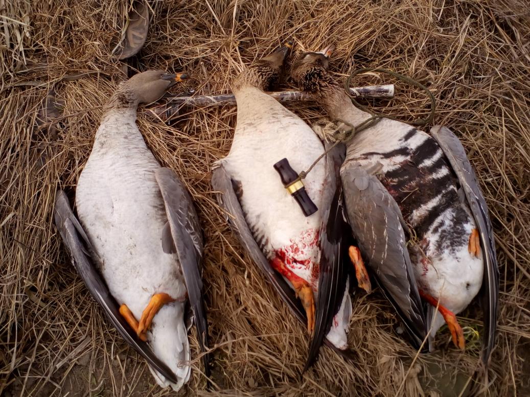 Как то стало уже привычкой, из-за нехватки времени ездить на гуся вообще без предварительной разведки, что не есть хорошо, конечно хотелось бы посвящать любимому занятию больше времени, но когда-нибудь так и будет. Приехав на место столкнулся еще с одной проблемой, выяснилось, что по нему ходят тракторы, боронят и сеют, поговорил с агрономом он сказал что с утром они приедут к 9 часам, даже не стал задавать вопрос можно ли прикопать скрадок. Набрал прошлогодней травы на обочине и начал думать как маскироваться. Первое что решил, для гуся было бы странным этот холмик - скрадок, внутри стаи чучал. В голом поле гуси этого избегают, по этому решил оттащить скрадок на 35 метров от чучал, затем каркас скрадка за счет ремней немного опустил (полностью не натянул), украсил скрадок собранной травой, стараясь чтобы было не угловато, а бесформенно, и не высоко. Чучела расставил небольшими стайками, но не подковой, а больше линией, подразумевая, что против ветра, хоть и не сильного, стаи будут садиться как раз у скрадка. Далее 50 грамм за открытие и спать. Вот оно долгожданное утро, в 4 уже в скрадке и приятно слышать как все пробуждается, сколько раз это наблюдал, но каждый раз это по разному, и каждый раз это завораживает.... Пара гусей появилась как всегда внезапно, недалеко слева, даю короткий призыв, без облета они заворачивают и выходят как раз между скрадком и чучелами, идут на посадку, и когда высота до земли 3 метра , дистанция 15 метров, чобы не прострелить чучела вскидываю ружье, стреляю 5 раз, и …… гуси улетают почти без потерь, почему почти, потому что на землю летит маленькое облачко пуха. Сразу отмечу, что задумка моя с переносом скрадка полностью себя оправдала, все налеты были как раз как я и планировал между скрадком и чучелами. Следующая стая была на приличном расстоянии, маню, заворачивает, и со стороны появляется еще одна, не замеченная сразу из скрадка, подлет происходит двух стай почти одновременно, расстояние как и в предыдущий налет, высота 10 м, вскидываюсь, стреляю 4 раза…. мимо, и на приличном уже расстоянии стреляю пятый раз, и вот он первый гуменик камнем падает с приятным БУХ. Подлет следующей стаи заметил совсем на подлете и ситуация очень похожа на предыдущую, за исключением того, что за подранком пришлось хорошенько сбегать. Был еще один налет пары гумеников, которые были успешно подманены и падали как и пара в первый налет, и в тоже место, но в этот раз одного выбил с второго выстрела, а второй улетел. Стрельба после зимы просто никакая. Ну и немного фото. Всех открывшихся С Полем!