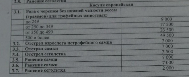 3.1. Рога с черепом без нижней челюсти весом (граммов) для трофейных животных: