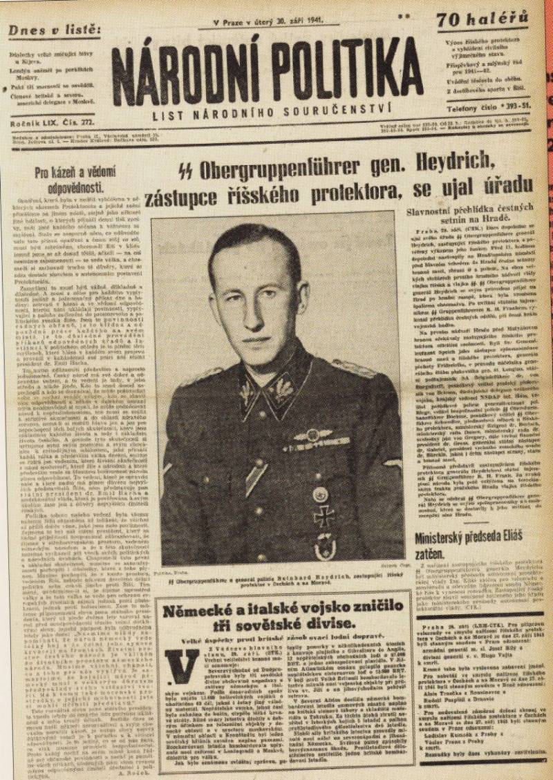 Передняя полоса чешской газеты «Народна политика»: объявление о вступлении Гейдриха в должность рейхспротектора