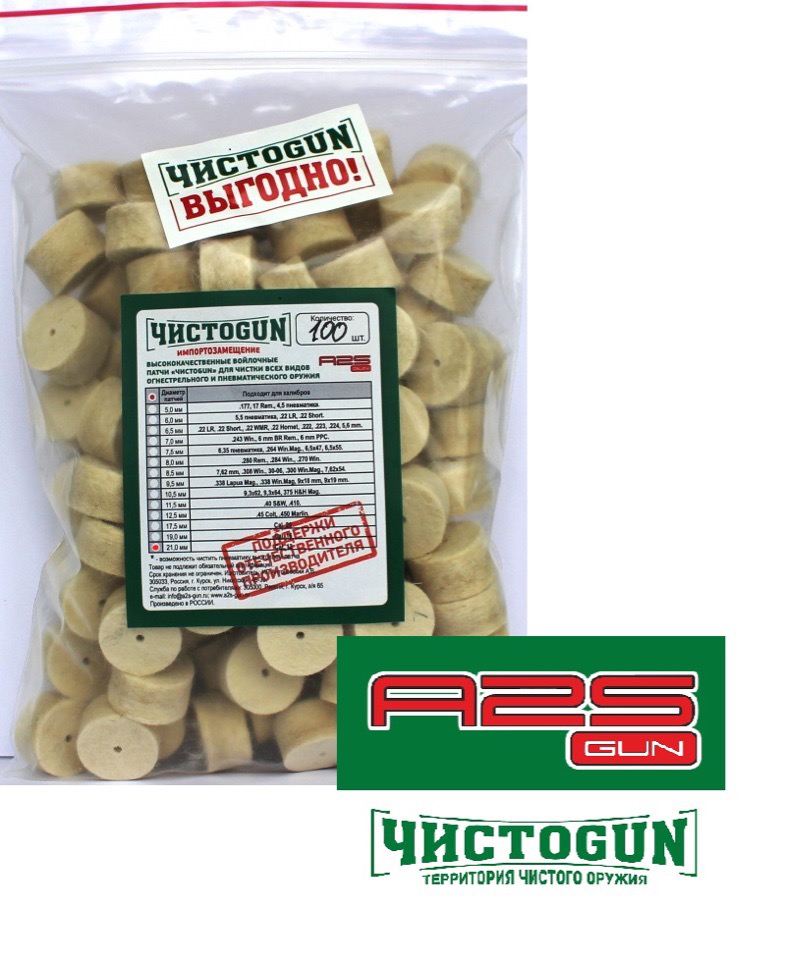 + Патчи войлочные ЧИСТОGUN 21,0-100 – диаметр 21мм, для чистки всех видов огнестрельного и пневматического оружия.