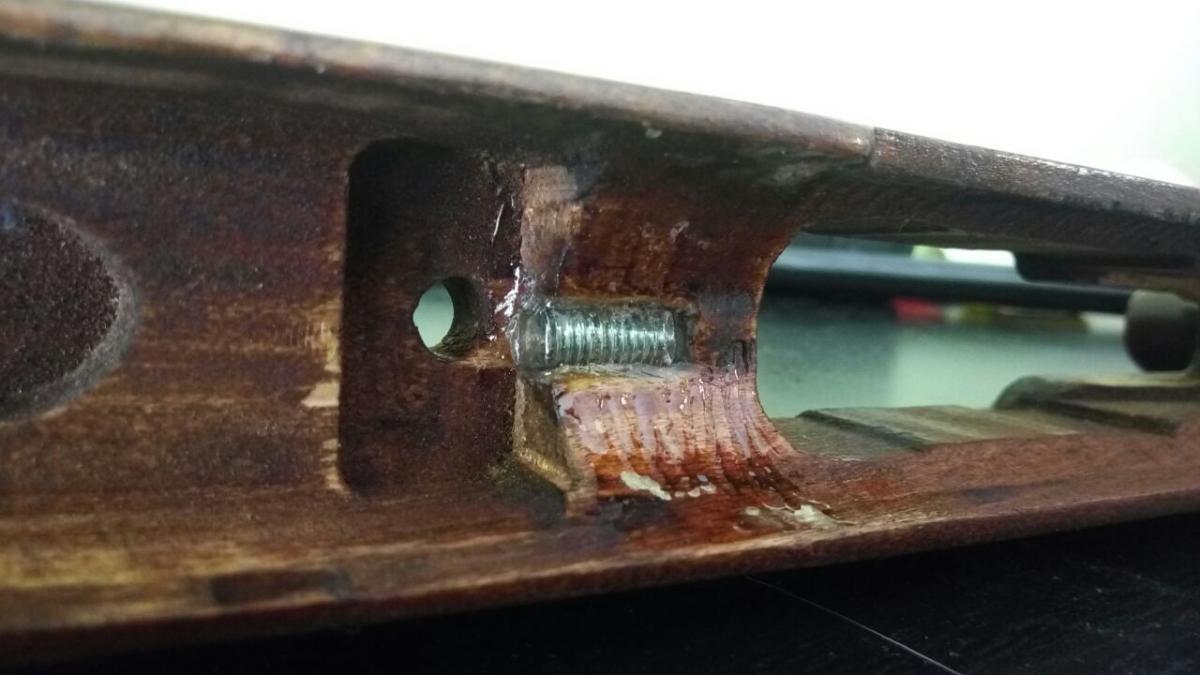 Так как ложе с одним нагелем, по методу ганзы установил металлическую проставку, дабы избежать новых трещин. Убран контакт железа с деревом.