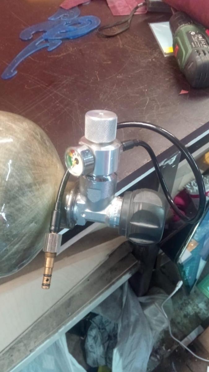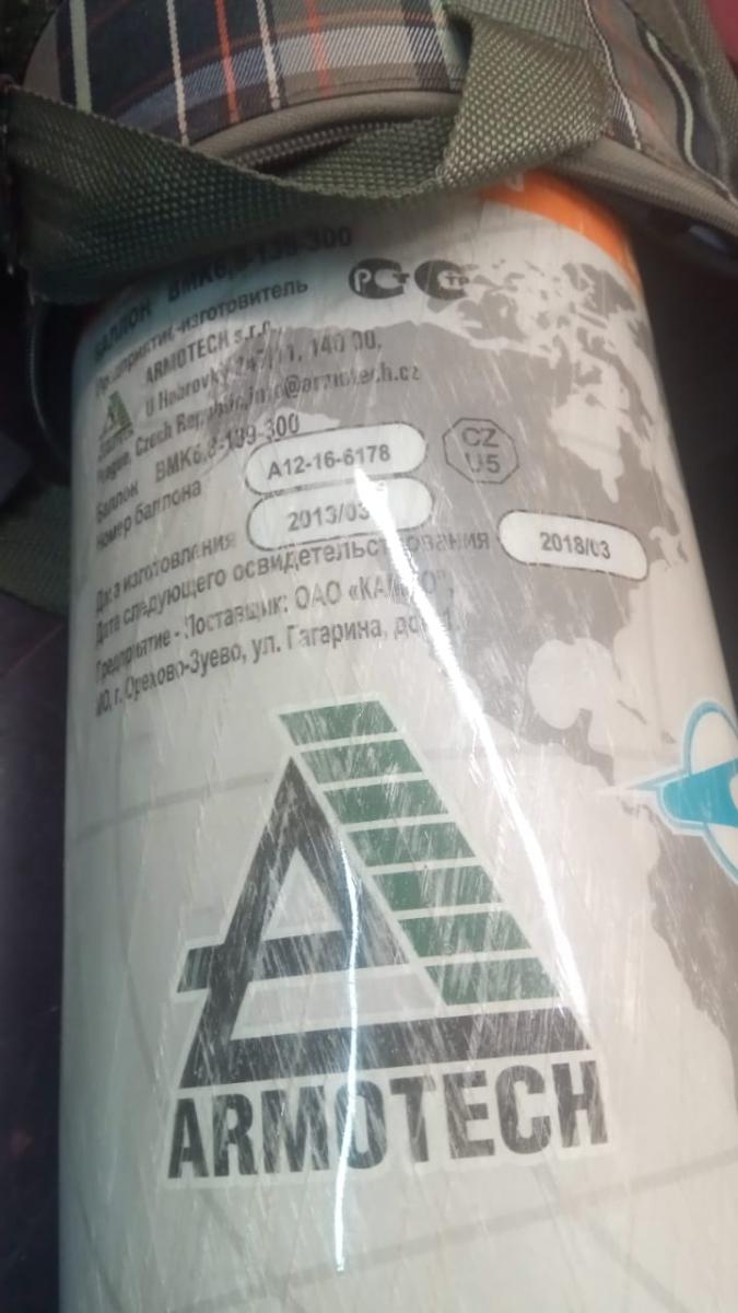 Баллон со штуцером и заправочной станцией, нужно проходить освидетельствование (первый раз его с чехла достал, обычно прям в чехле отдавал на зарядку, даже не знал что пора уже), заправлен воздухом.