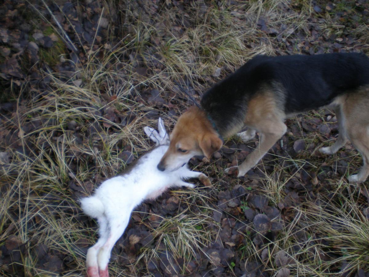 Подождав, пошёл к месту останова собаки. Увидел потрёпанного зайца и довольную