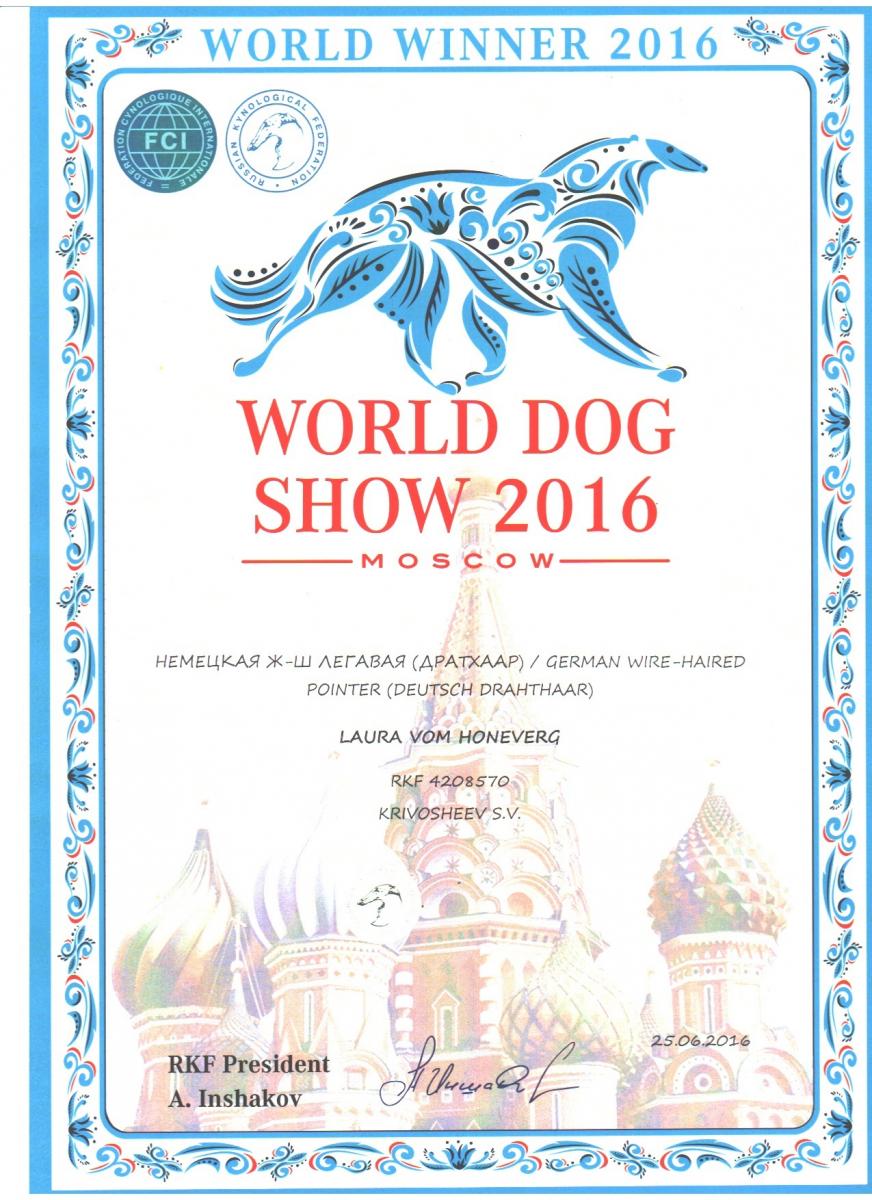- Hegewald-2016: 242,5 Hegewaldpunkte, 5 место среди 155 собак, наивысшие оценки (12) за чутье и работу на воде,