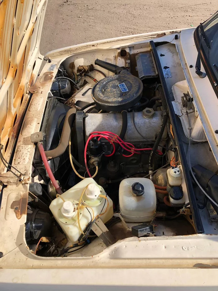 Резина на автомобиле — еще заводская Ми-16 советского производства, а запаска еще никогда не снималась. Багажник 2105 был забит различным барахлом времен СССР (включая туристическую палатку), среди которого нашлась сумка с инструментом и даже пластиковая канистра с моторным маслом еще тех лет!