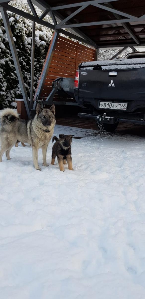 Отдам щенка (девочка). На фото она с матерью. Смесь ЗСЛ (отец) и норвежский Элкхаунд (мать), на мать документы прилагаются. Отец сосед, тоже породистый. Щенки родились 6 октября 2019 года- 5 мальчиков , одна девочка. Всех разобрали, и на эту тоже был хозяин-но в последний момент отказались по причине недоговоренности в семье. На данный момент все прививки щенку сделаны, ветеринаром проверена-паспорт заведён. Девочка активная, добрая, здоровая. Ищем только надежные, добрые руки, желательно в пригород, собаке необходим подвижный образ жизни.