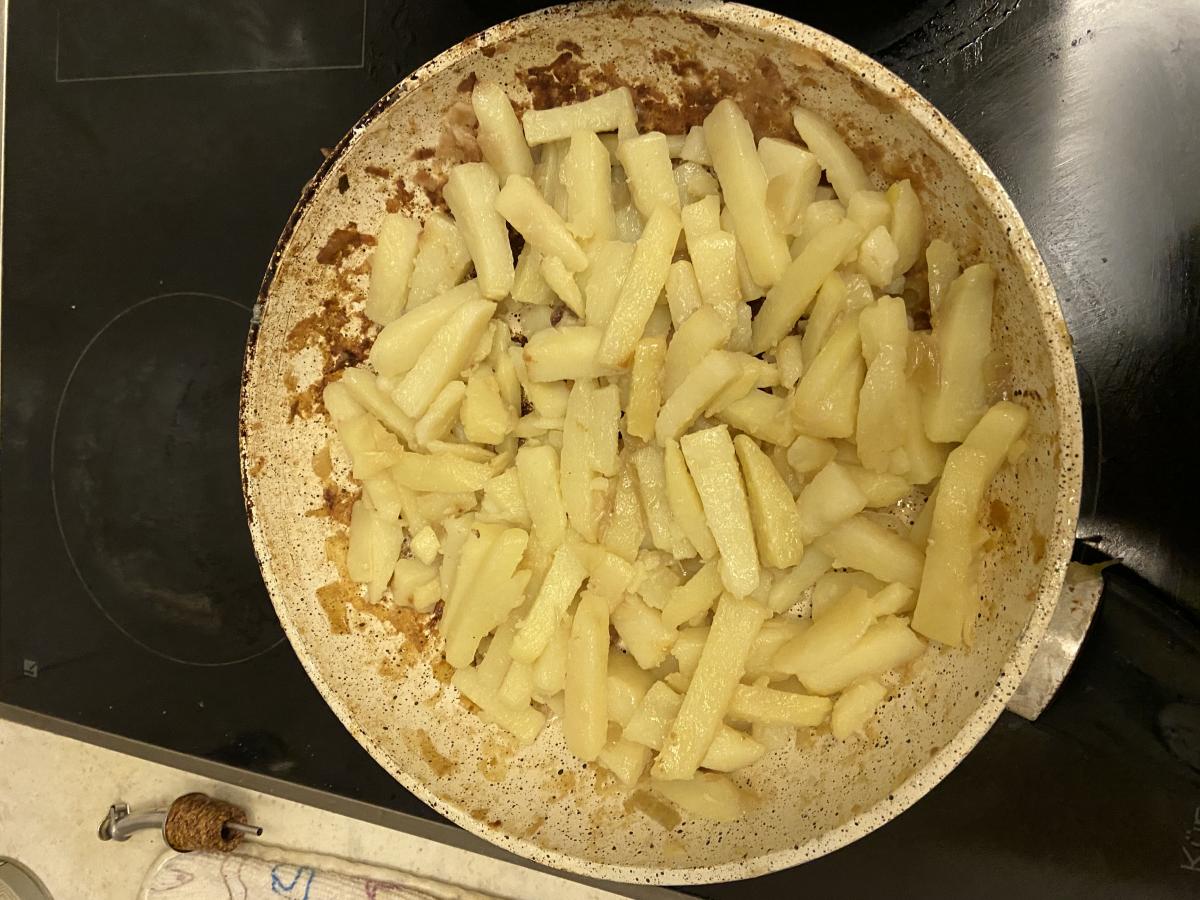 Пока наше мясо томиться берем вторую сковороду, кладем в нее оставшееся соло и жарим на нем заранее порезанную картошку с лучком!