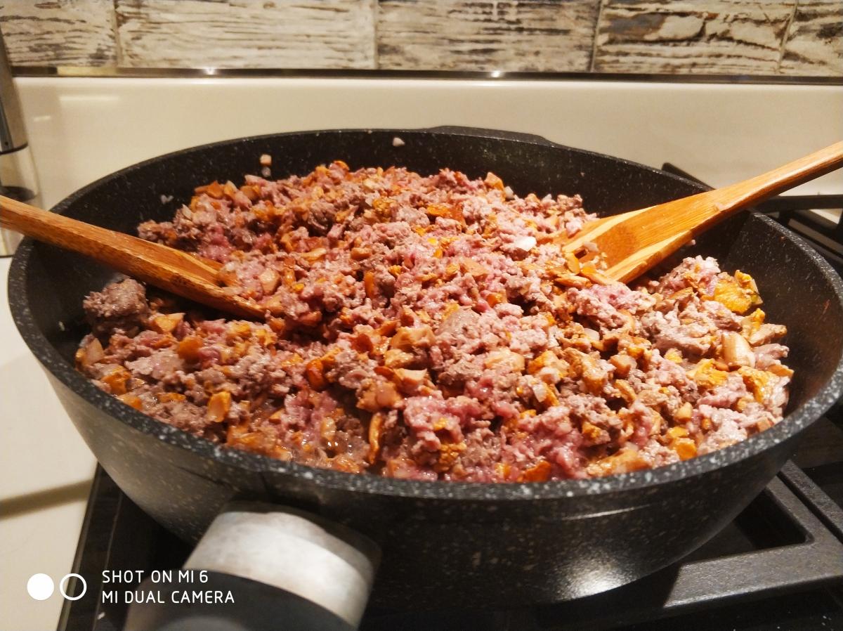 Тем временем, фарш с грибами уже готов полностью. Нужно ему немного остыть. Так чтоб не жгло руки.