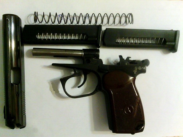В комплекте родные втулка и рукоять, два магазина, две кобуры (для ношения на поясе и за поясом), поясная сумка для скрытого ношения, витой страховочный трос, документация.