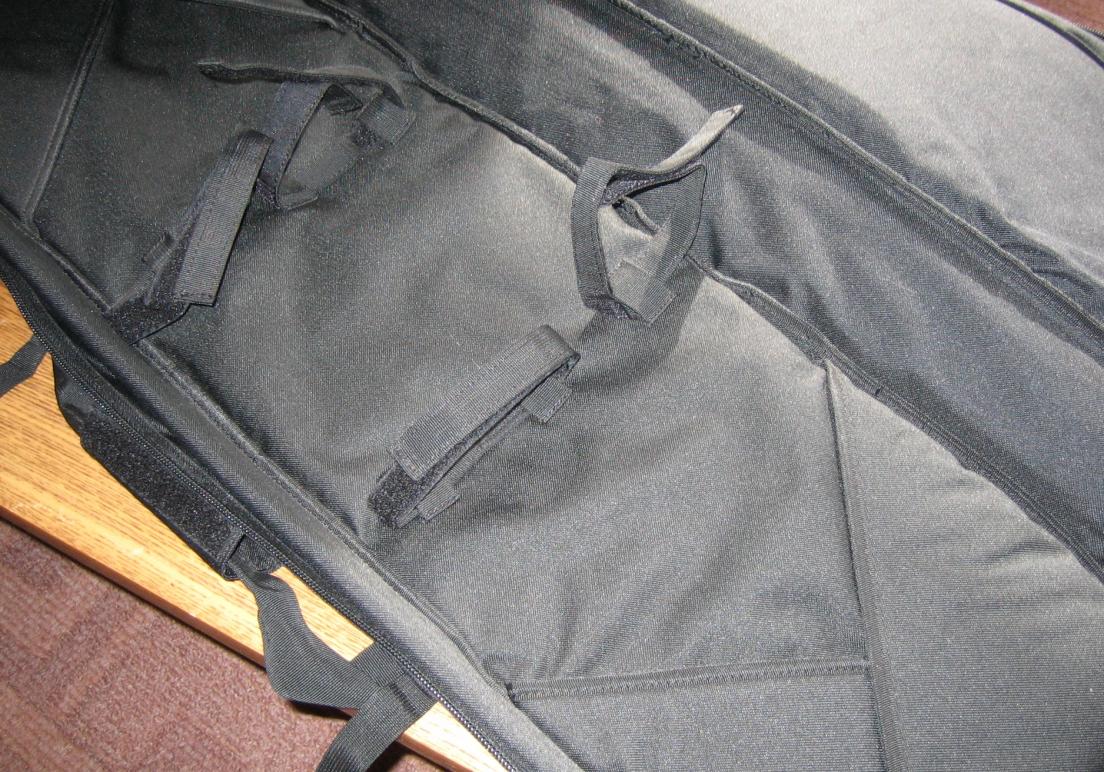 Конструкция из полиэстера 600 ден. Три внешних кармана на молнии для принадлежностей ( Центральный два отделения несъемный,два боковых съемные - система молле) и основное отделение с мягкой подкладкой около 10 мм толщиной по периметру, с кармаными по углам под ствол и приклад и четыре застежки на липучках для крепления двух ружей. Удобная ручка с застежкой-липучкой и плечевым ремнем облегчают переноску. По бокам ручки две стяжки с защелками. На тыльной стороне ремни для крепления. Ремень для переноски можно переставлять. В принципе при можно как рюкзак одеть за спину, мне не удалось, толи толстый, то ли высокий