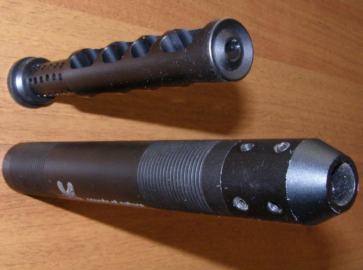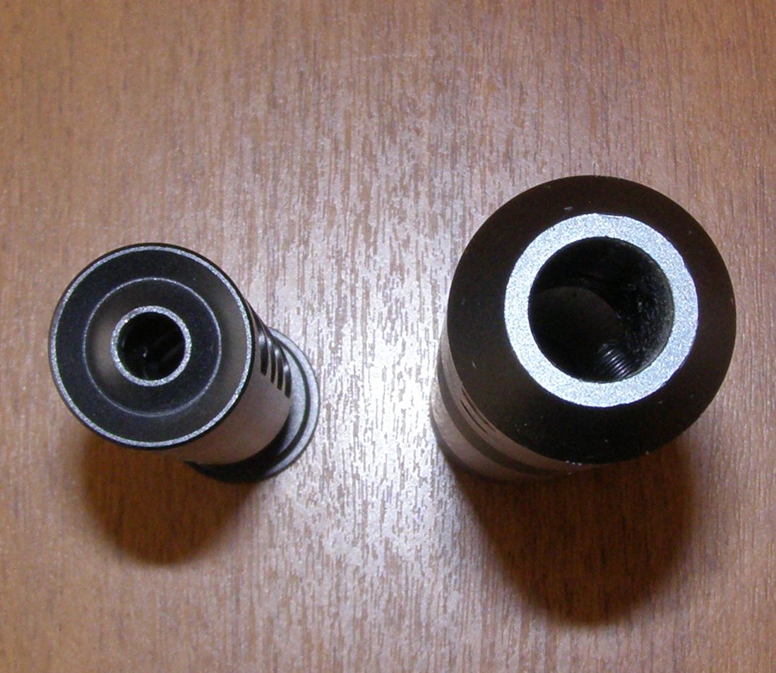 Внешний диаметр 30 мм. Внутренний пулевой 8 мм. Внутренний на посадку ствола 14 мм. Обжимается ствол винтами под шестигранник с четырех сторон. Общая длина 215 мм. Вес - не взвешивал. Материал, как утверждал продавец авиационный дюраль.