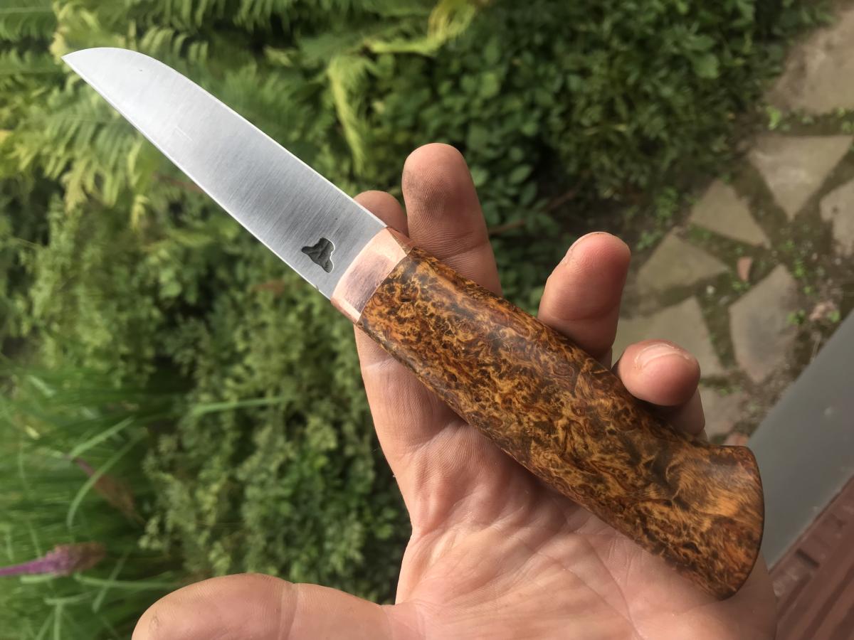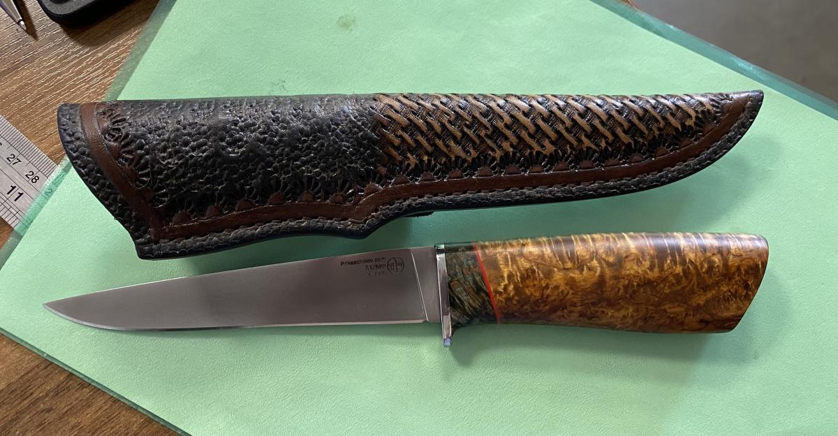 Цена?Нож скандинавского типа, карельская берёза, клинок кованный 9ХС, ножны кожа растительного дубления.