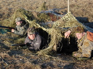 Перед весенней охотой 2007 года сшил себе маскхалат типа снайперского - нашил на плащ-палатку рваных тряпок соответствующей расцветки. Маскирует неплохо. Мажет быть, кто-то из форумчан тоже так охотится? Поделитесь опытом!