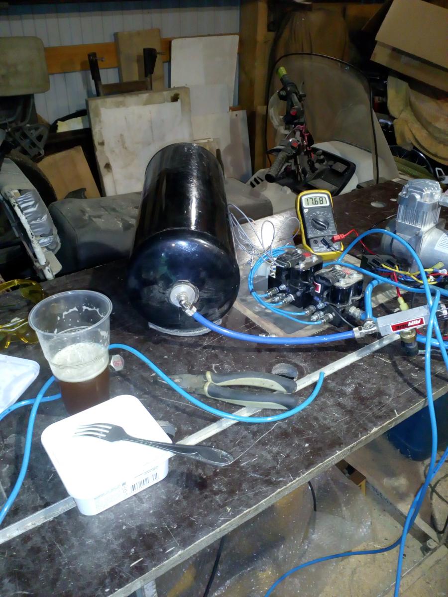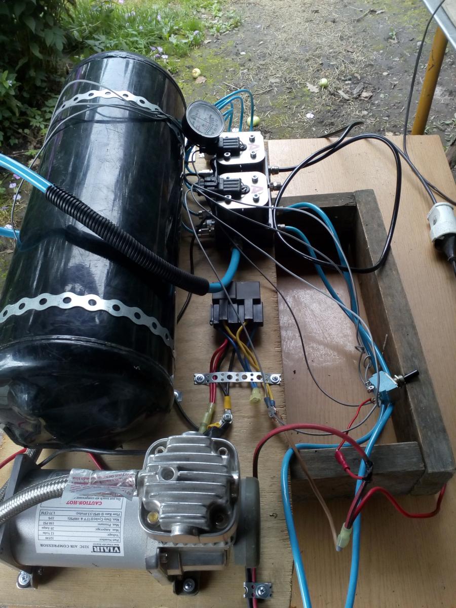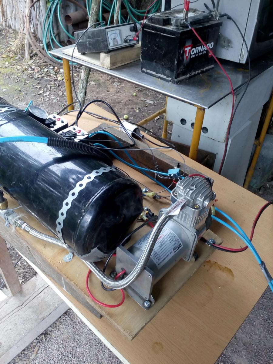 Модернизировал пресс для сока: две тормозные пневмокамеры "тип-24", компрессор, пневморесивер и набор электроклапанов от снятой системы пневмоподвески.