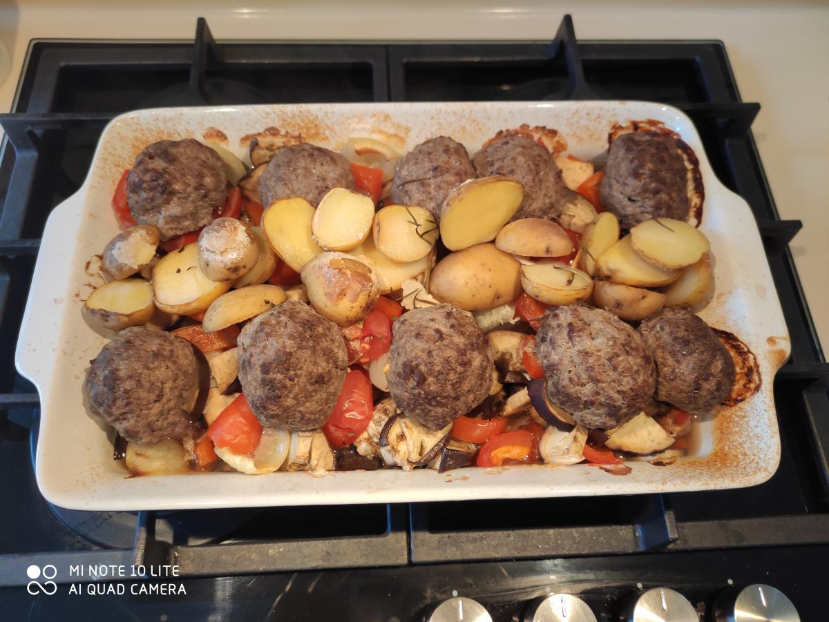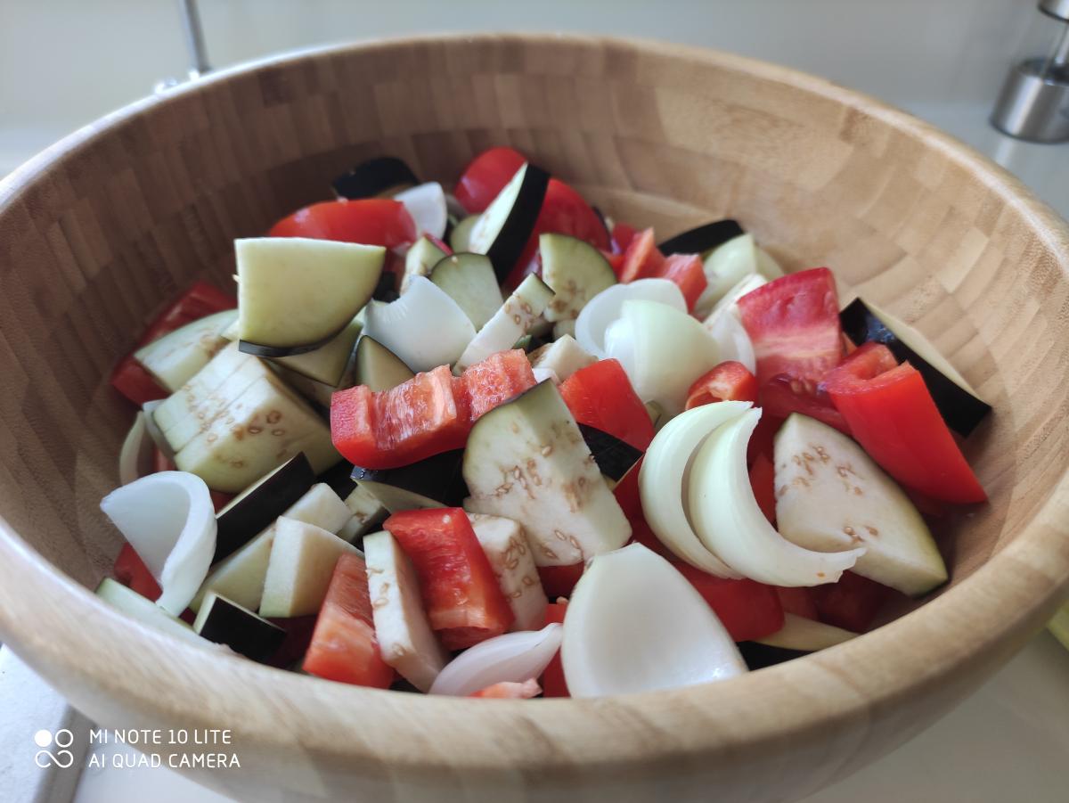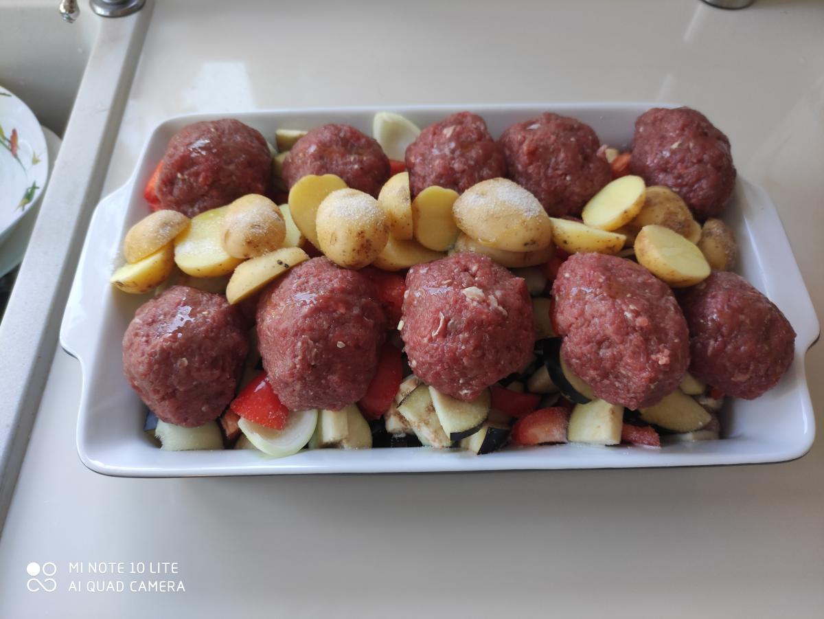 Овощи в керамическую латку, пару ложек оливкового масла, сверху мясо: