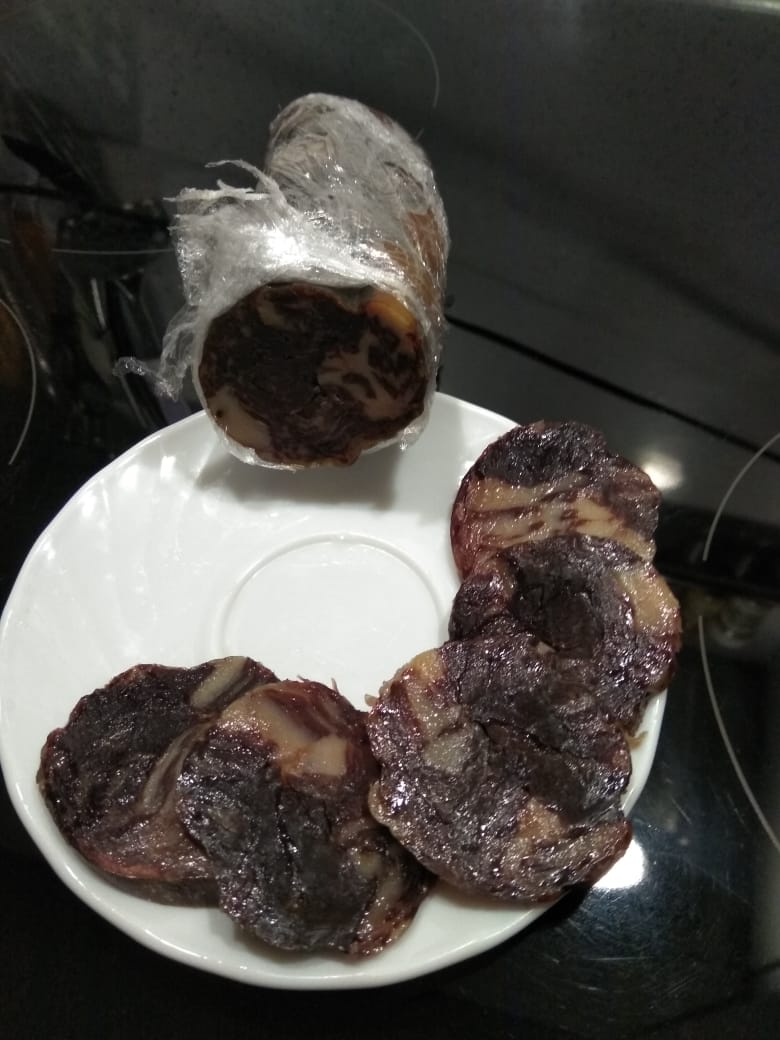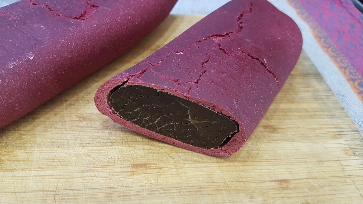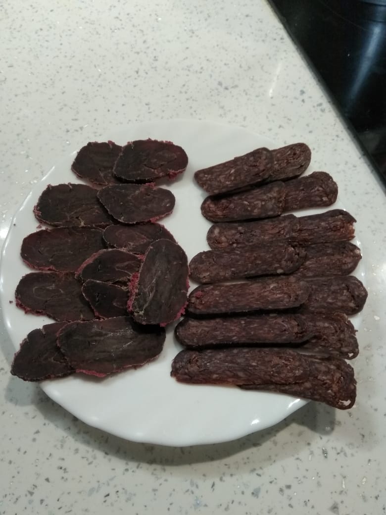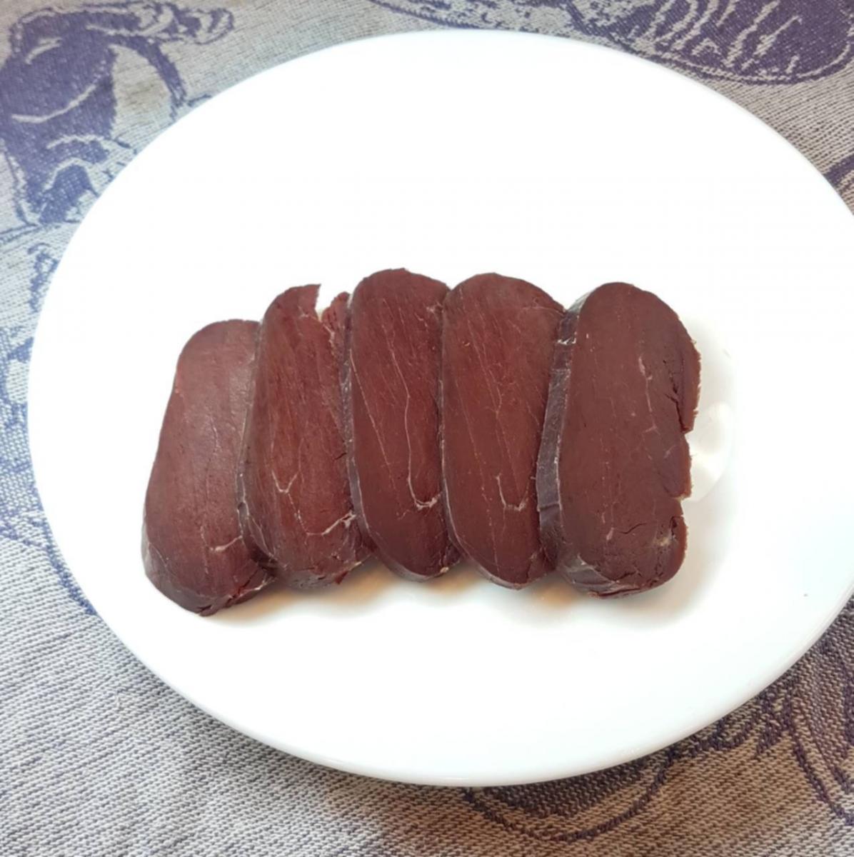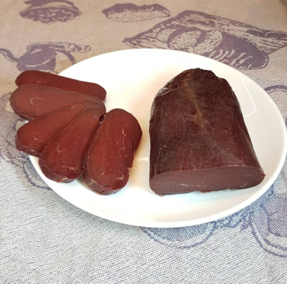 Состав - филейная часть говядины, специи. Изготавливалась больше месяца. Сначала вымачивается под прессом, затем медленно вялится. Может использоваться как самостоятельный деликатес на столе, так же отличная закуска под любое спиртное. Срок хранения 6 мес.
