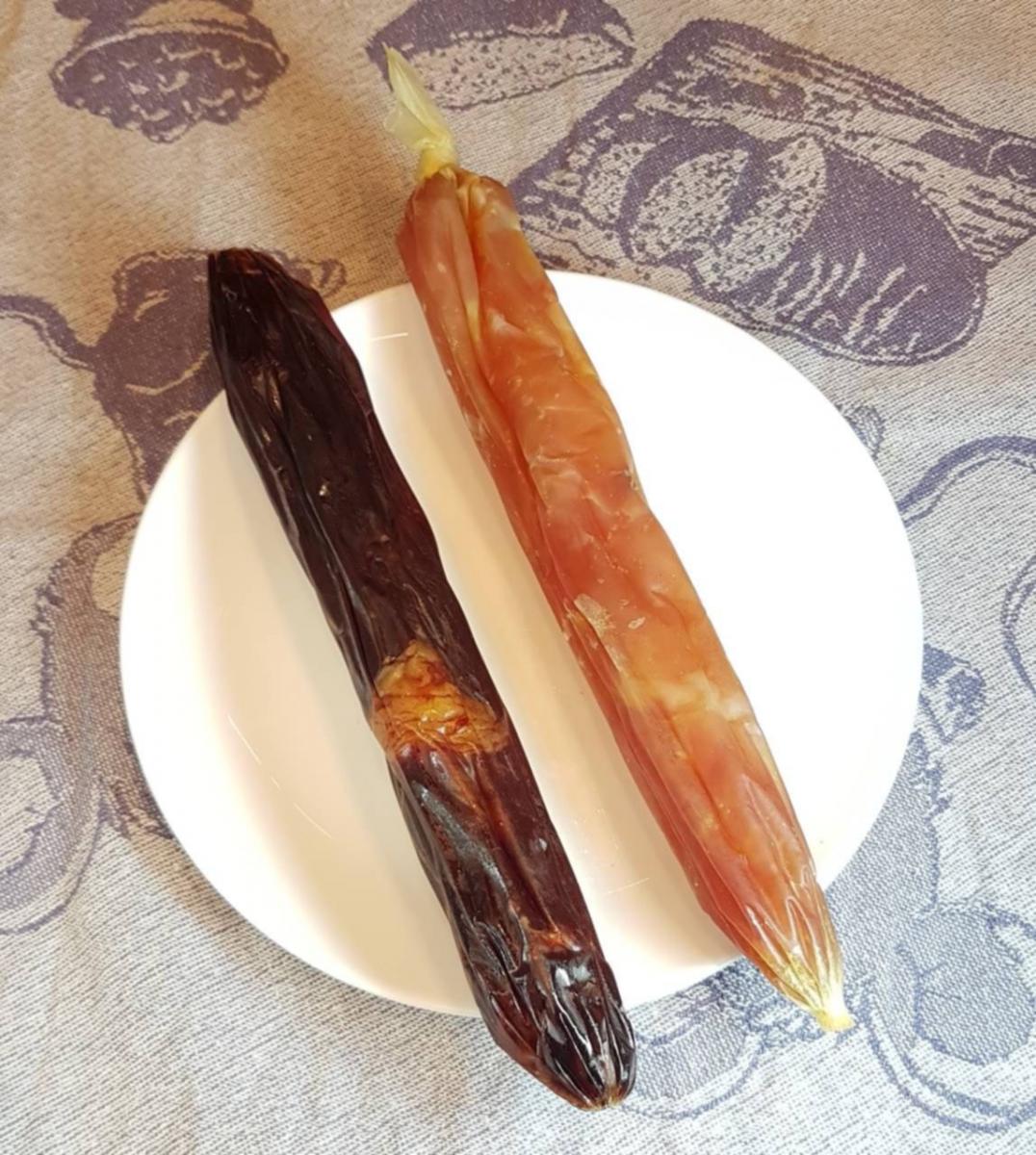 Конина отборная, жир-сырец, специи по специальному рецепту, в натуральной кишке. Одна колбаска весит около 0,5 кг.