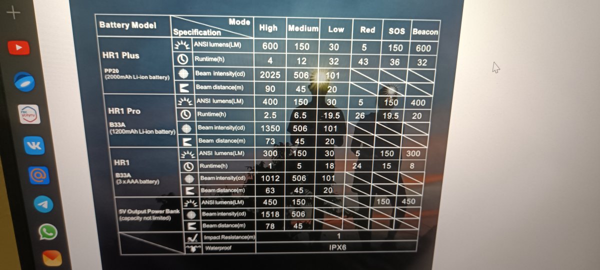 Я в посту выше писал про HD15 . У него на каждом светодиоде в турбо режиме максималка 1000 люмен , режимов 2 - суммарно 2000 люмен . В режиме HI при котором голова со светодиодами греется не сильно 400+400 Аккумулятор на 3000 мАh